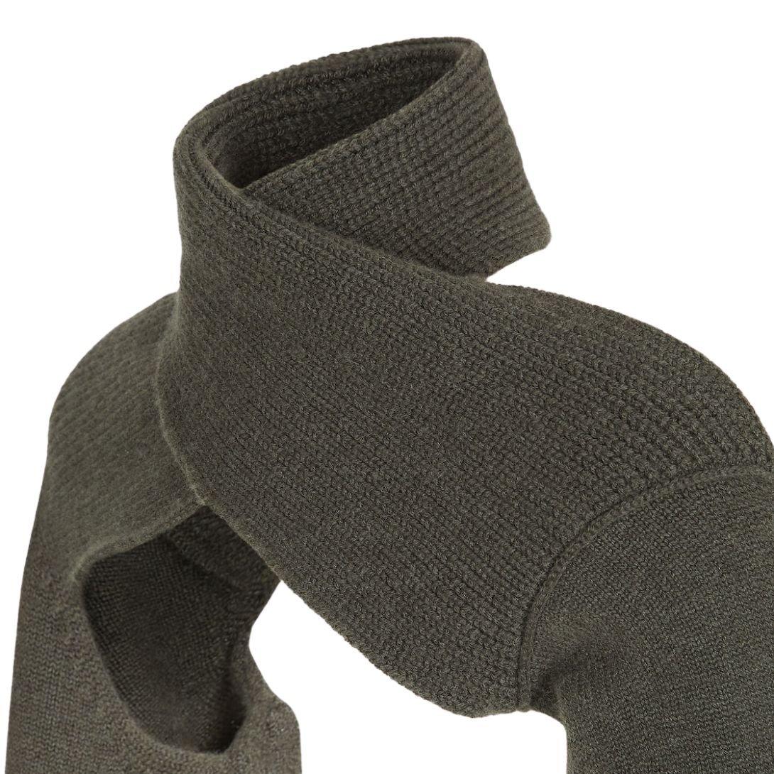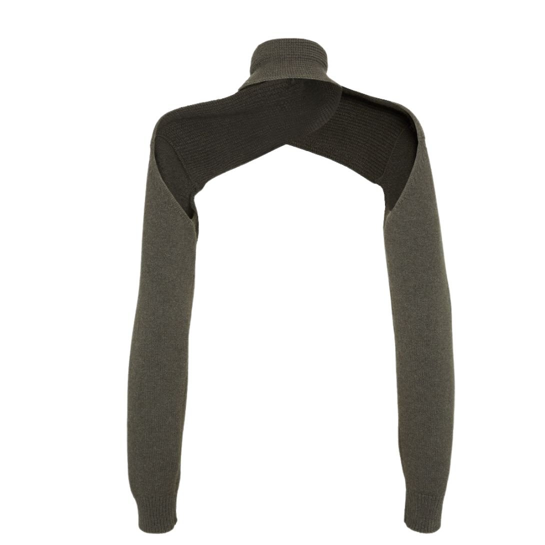 This shrug with a high collar offers a unique and stylish addition to any wardrobe. Made from dark green cashmere jersey, the piece features a front wrap design with a scarf detail in a fisherman’s rib knit, while the sleeves are crafted in a plain-knit style. Ribbed cuffs complete the look, and the contrasting embroidered Fendi Roma logo on the left-side sleeve cuff adds a signature touch.