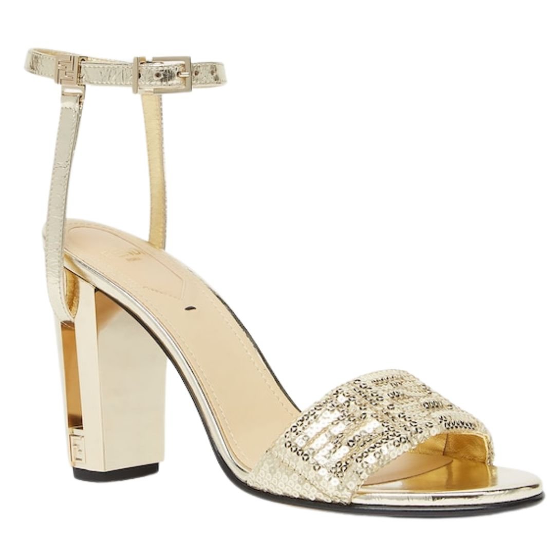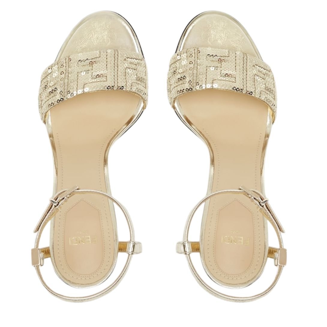 The lightly padded satin band is adorned with gold-colored FF sequin embroidery, creating a sparkling, refined effect. An ankle strap ensures a secure fit, while the heel is designed with a cut-out detail and a tone-on-tone FF motif, offering a modern and bold look. Gold-finish metalware further elevates the design.