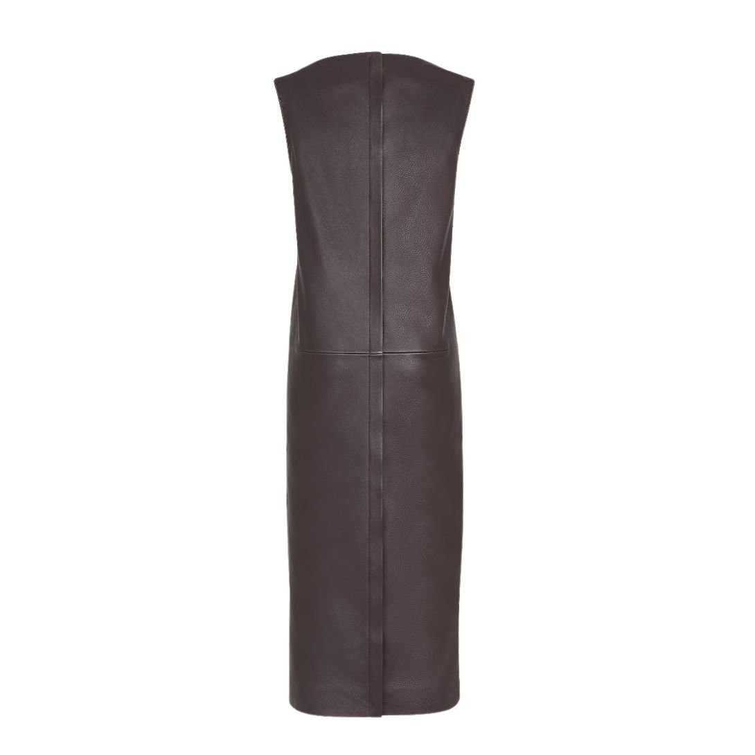 This striking sleeveless short dress embodies sophistication and craftsmanship with its sleek, modern design and luxurious leather material. The straight-cut silhouette offers a streamlined look, while the boat neck and concealed full-length zipper at the back add to its refined aesthetic. Crafted from soft, dark purple hammered leather, this dress stands out with its unique texture and high-end finish. The armholes are carefully embellished with hand-sewn tone-on-tone macro Selleria topstitches, a hallmark of Fendi’s iconic Selleria craftsmanship passed down through generations.