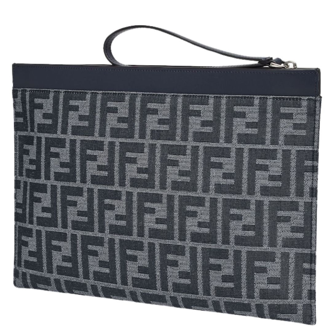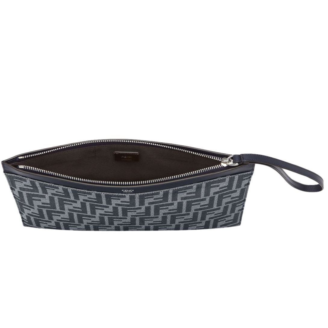 This medium-sized flat pouch is crafted from vibrant royal blue FF jacquard fabric, showcasing the iconic Fendi pattern in an eye-catching shade. The design is complemented by tone-on-tone leather details, adding a refined and sophisticated touch.