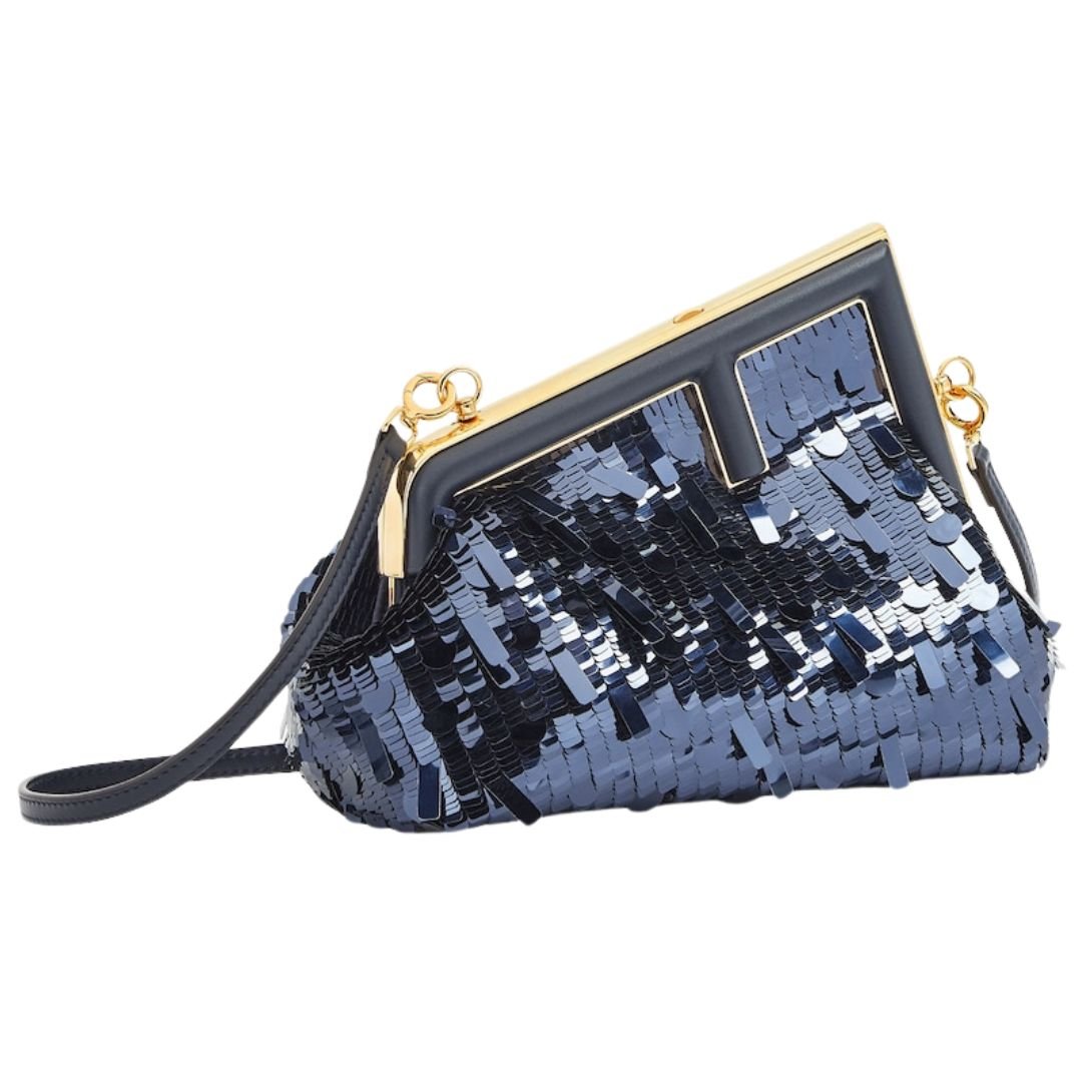 With its oversized F clasp and dark blue sequin embroidery, the Small Fendi First Bag is a truly distinctive accessory that offers both glamour and practicality, perfect for elevating any ensemble.