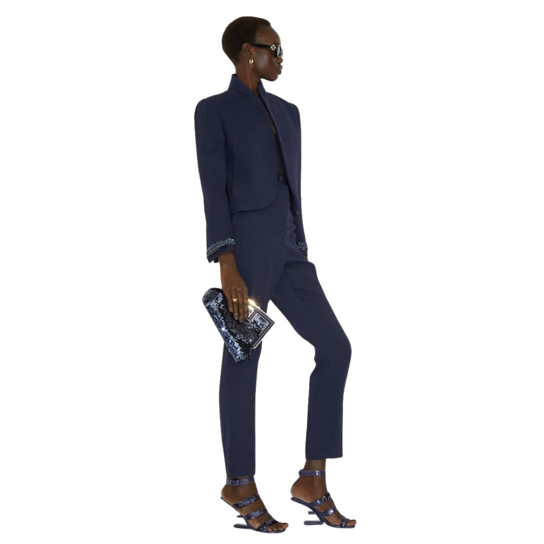 - The bag is embroidered with dark blue sequins in various shapes and sizes, creating a dynamic, textured surface that catches the light beautifully.