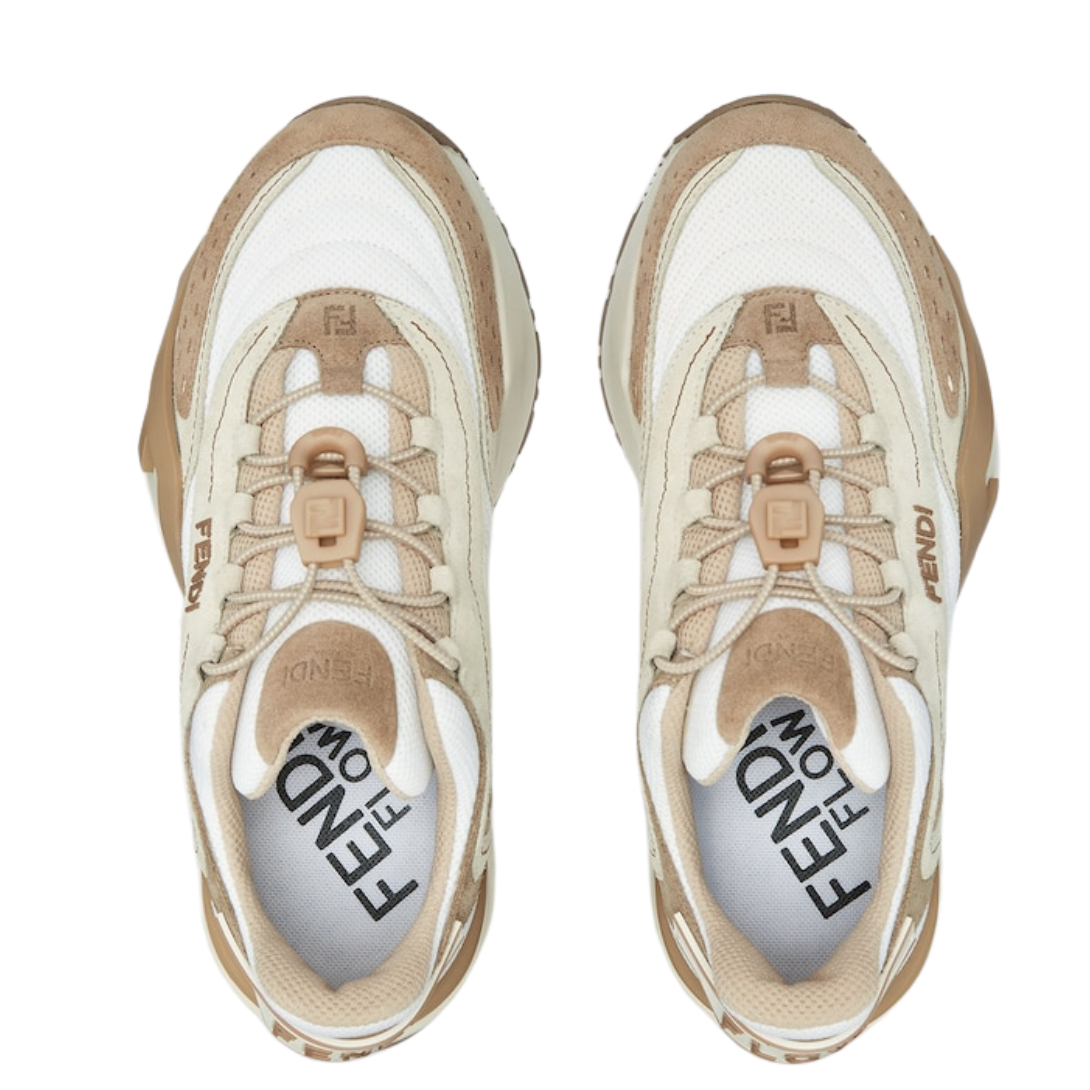 The Fendi Flow sneakers offer a seamless blend of sporty aesthetics and luxury. Designed with adjustable elastic laces and a drawstring fastening for a personalized fit, these sneakers are crafted from white tech mesh with complementary suede inserts in white and beige. Customized with a suede label and embossed FF on the tongue, along with a rubber tab embossed with the Fendi logo at the back of the heel, they exude sophistication. The 35 mm rubber running sole features a beige diagonal F motif, combining style and performance in every step.