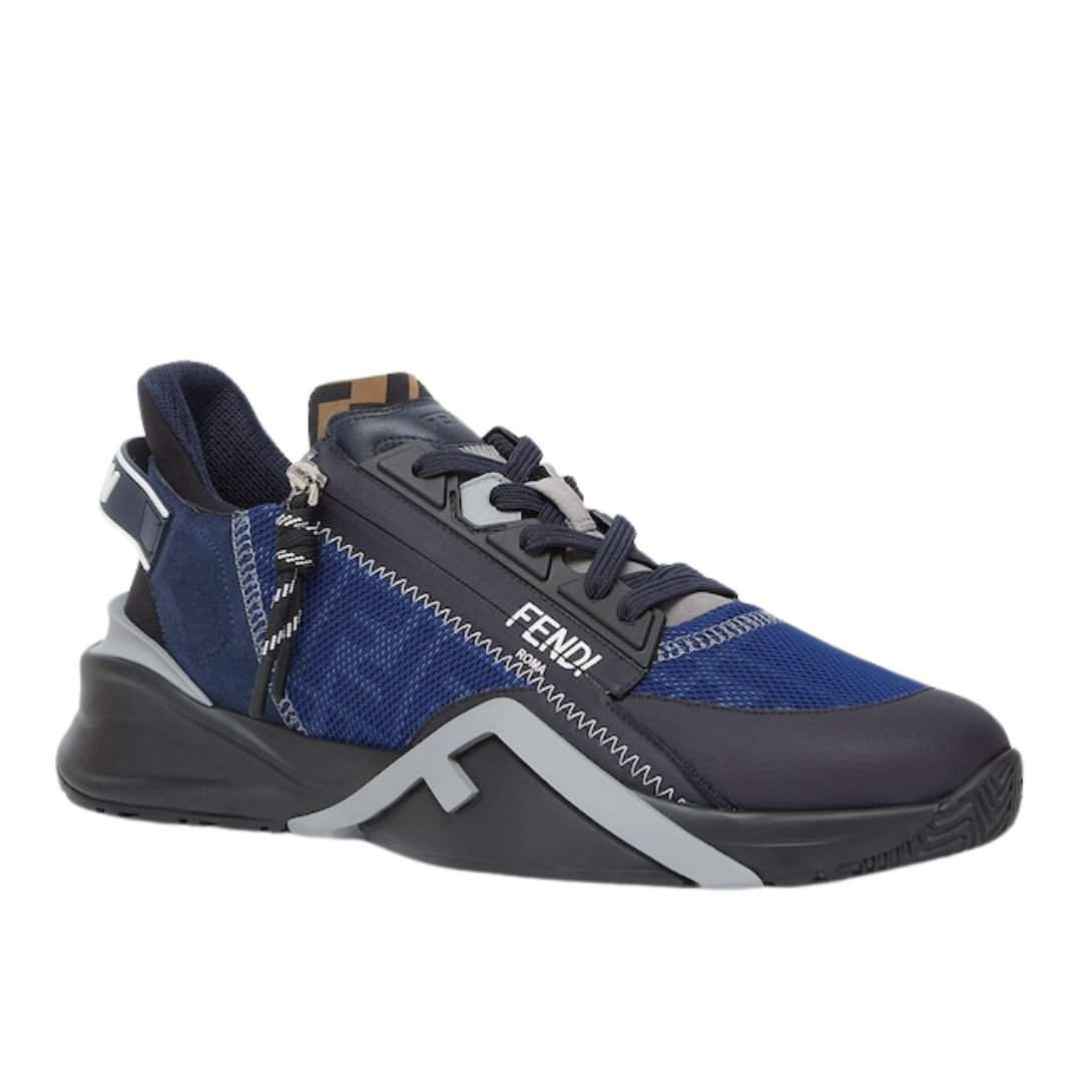 The sneakers feature a corrugated sole with “Fendi Flow” lettering embossed on the heels, showcasing a signature Fendi detail. The upper is crafted from navy blue FF Lycra®, complemented by dark blue suede and leather accents for a refined and cohesive appearance.