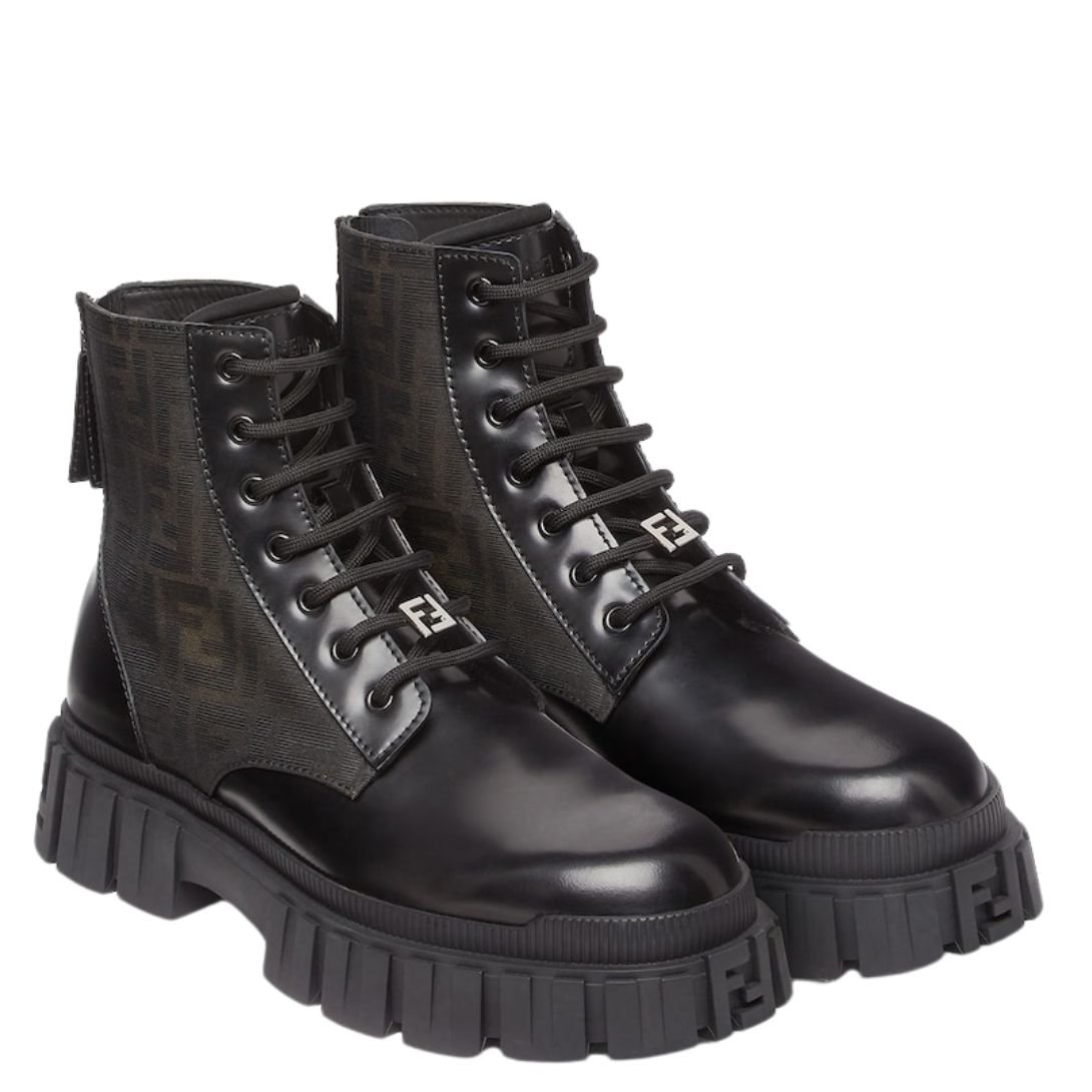 Crafted from black leather, these boots are adorned with FF Eclissi jacquard inserts, hand-shaded in brown at the edges for a unique and refined look. The combination of textures and colors enhances the overall design, making them a standout piece.