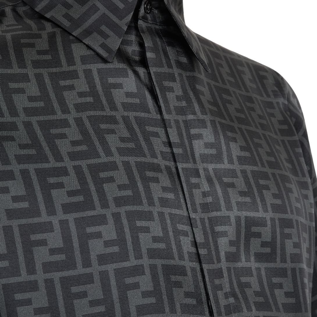 Made from gray silk, this shirt is adorned with a matching all-over FF motif, providing a sophisticated and refined pattern. The silk fabric ensures a smooth, luxurious feel.