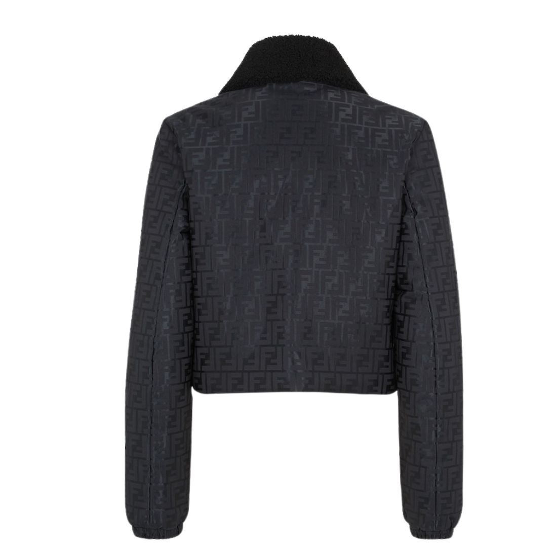 Crafted from technical nylon jacquard fabric, the jacket showcases the iconic black FF motif, adding a bold and distinctive look. The tonal sheepskin collar enhances the design, offering both style and warmth.