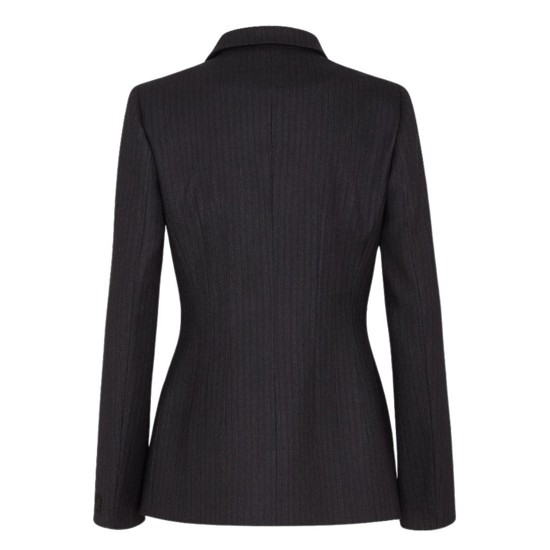 Crafted from black pinstriped wool, this blazer combines classic pinstripes with contemporary tailoring. It includes a breast pocket and welt pockets for functional refinement. The concealed single-breasted closure creates a polished and seamless look. Fully lined for comfort, this blazer is as practical as it is stylish.
