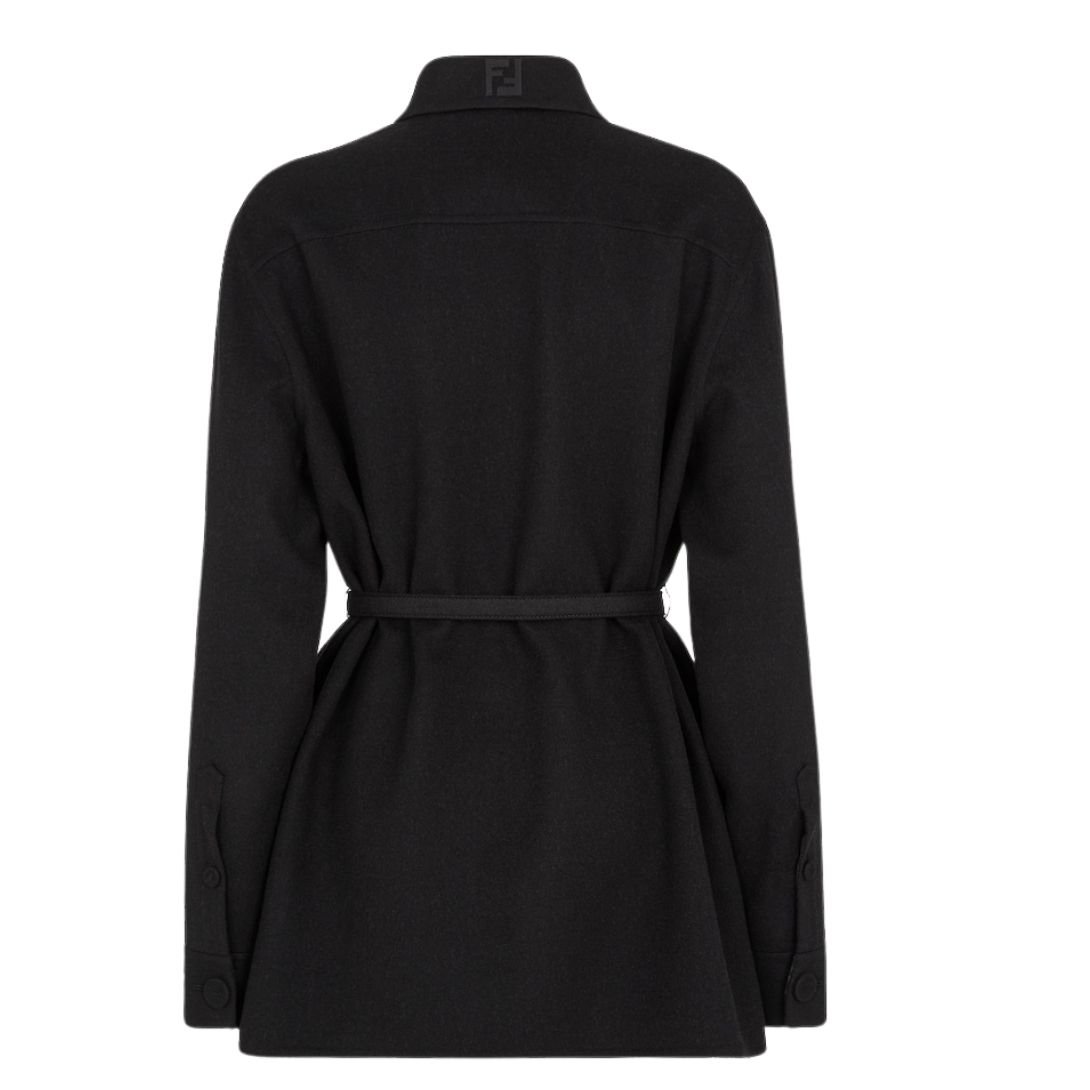 Made from lightweight black wool double fabric, this jacket offers a refined aesthetic and versatile layering options. The matching belt with a metal FF buckle cinches the waist for a tailored silhouette, while the concealed button closure ensures a sleek finish. The interior lining is customized with a gray FF motif, adding a discreet nod to Fendi’s iconic branding. The embroidered FF logo on the back of the collar enhances its understated charm.