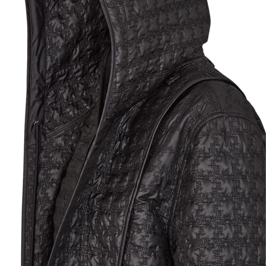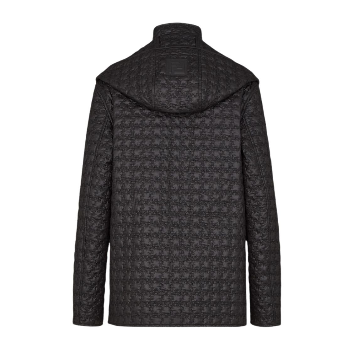 Crafted in Italy from high-quality black nylon, the jacket showcases all-over houndstooth-pattern quilting, providing both warmth and a visually striking texture. The drawstring hood is enhanced with a foulard-like insert, creating a double-layer effect for added style and practicality.