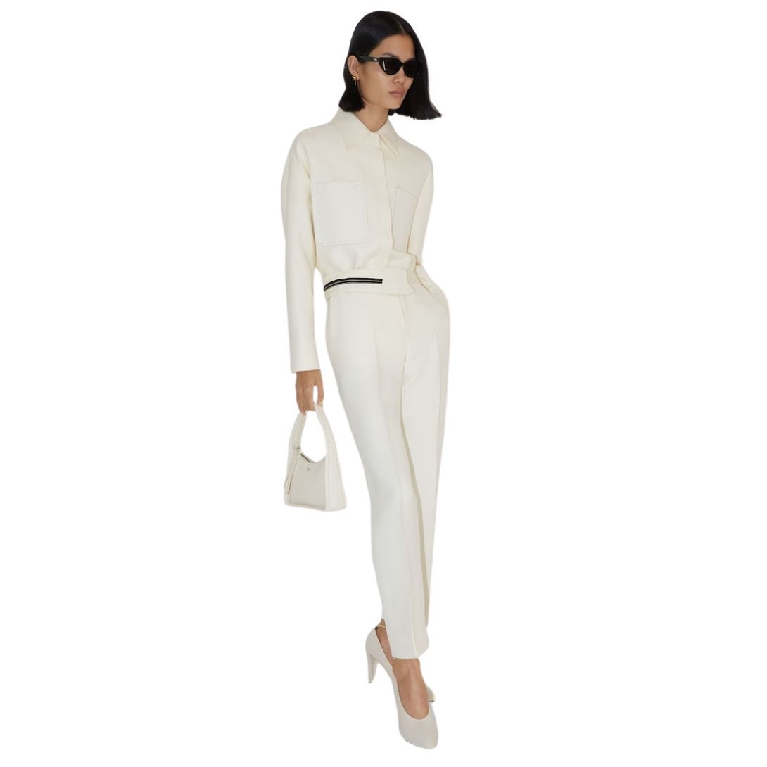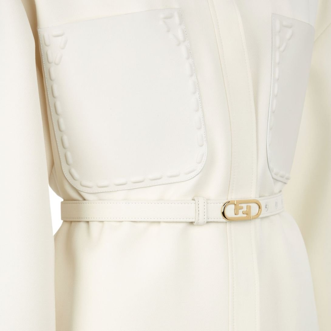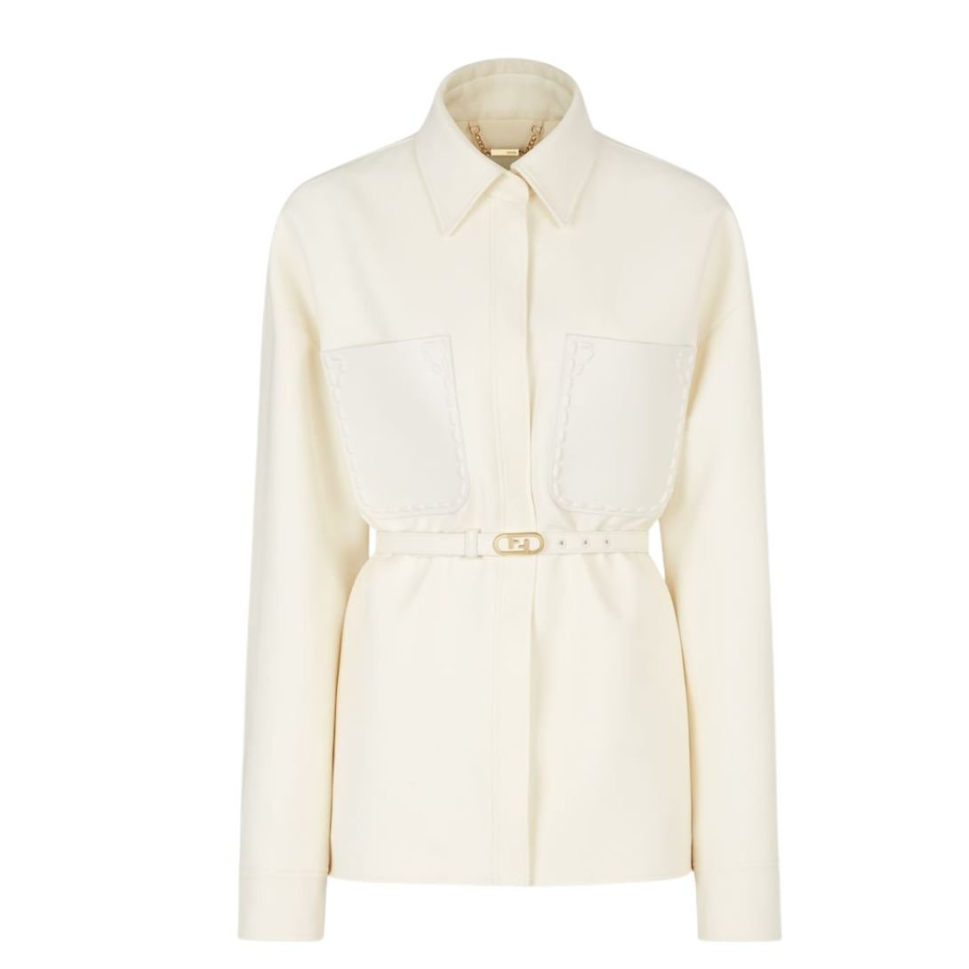 This single-breasted Go-To jacket combines elegance and functionality. Featuring a shirt collar, low-cut set-in sleeves, and oversized patch pockets on the chest, it offers a relaxed yet sophisticated silhouette. The matching belt with a metal Fendi O’Lock buckle completes the look.