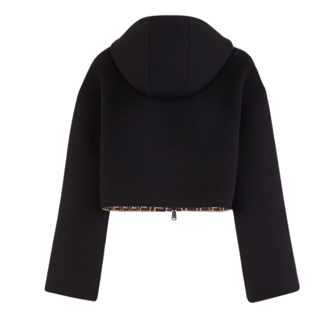 Crafted from black double-sided wool fabric, this jacket offers two styling options for ultimate versatility. Tone-on-tone calf leather pockets add a luxurious touch, while the interior lining is customized with an all-over FF motif, showcasing Fendi’s iconic design.