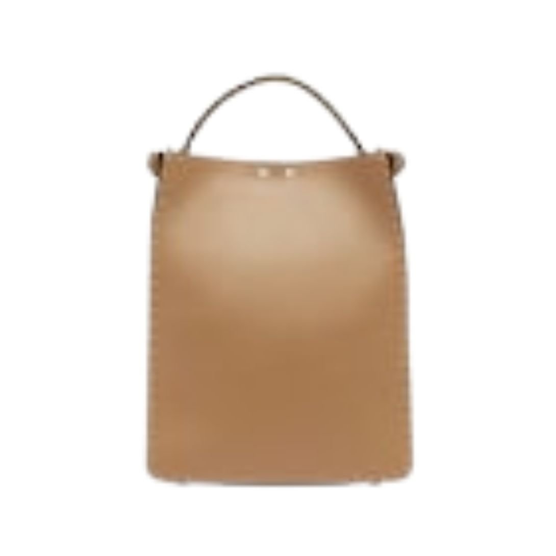 The Small Peekaboo ISeeU X-Lite is crafted from beige Cuoio Romano leather, showcasing 524 hand-sewn tone-on-tone macro topstitches. This signature Selleria craftsmanship, passed down through generations of Fendi artisans since 1925, adds a distinctive, luxurious touch to the bag.