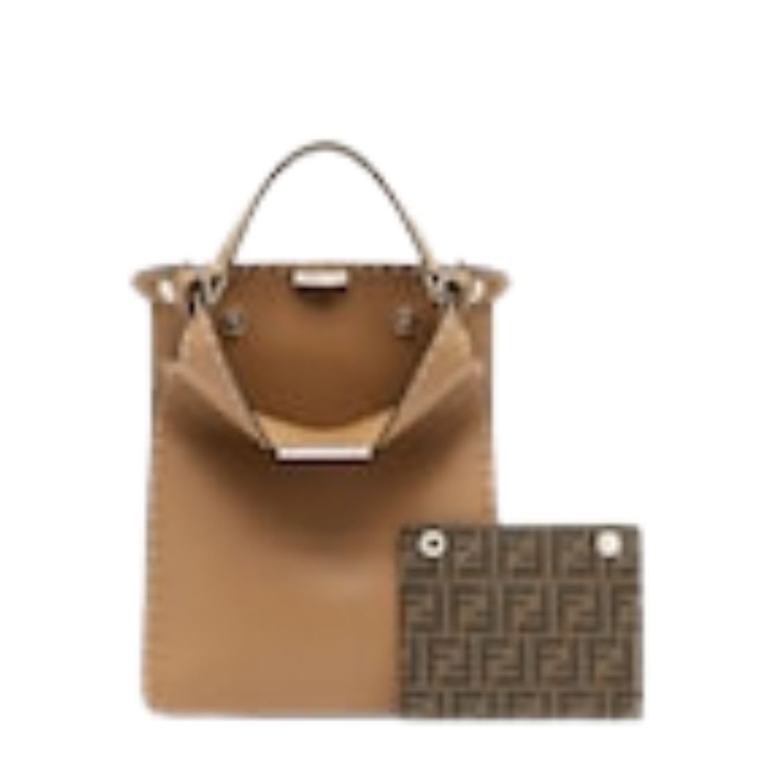 The bag features an internal compartment with Fendi’s iconic twist lock for secure closure, along with a dedicated compartment designed to hold a 13″ laptop. The removable inner pocket is made from beige leather with a hand-stitched Fendi Selleria numbered silver tag on one side, and brown FF canvas on the other, providing both style and practicality.