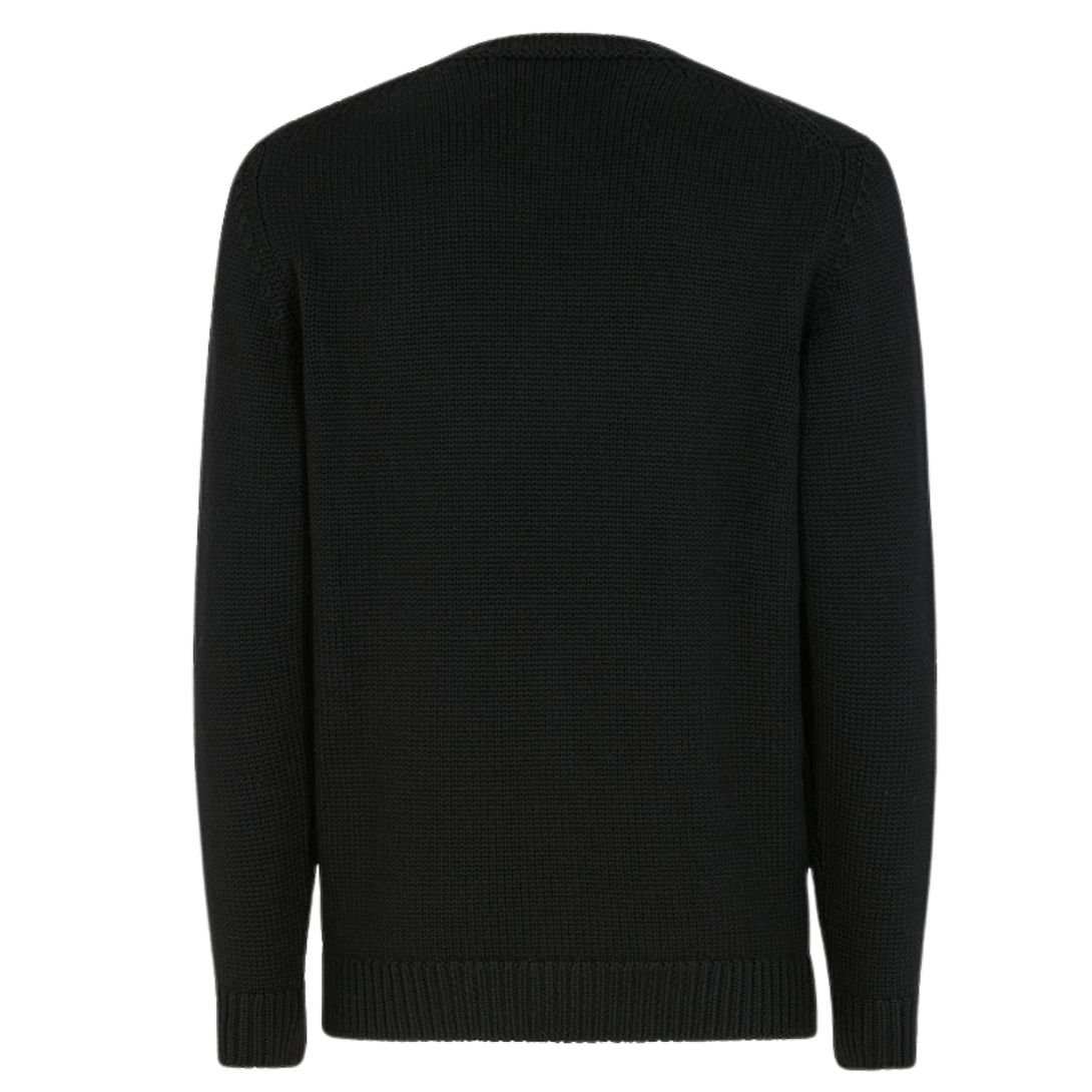 This sweater features a modern round neck and long sleeves, offering a clean and classic silhouette. Made from luxurious Black wool, it serves as a versatile base for a variety of outfits. The standout feature of this garment is the inlaid FENDI lettering, which is crafted in a contrasting color, adding an eye-catching detail that highlights the brand’s iconic identity.