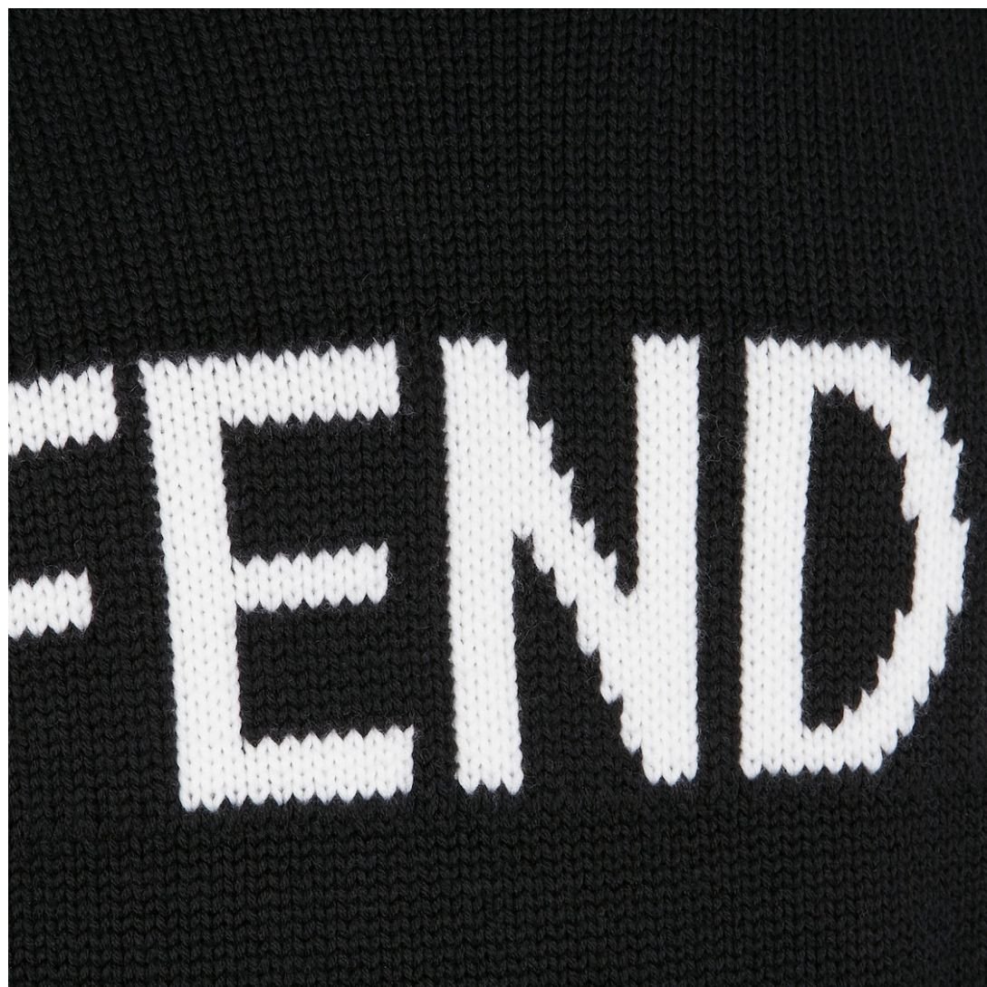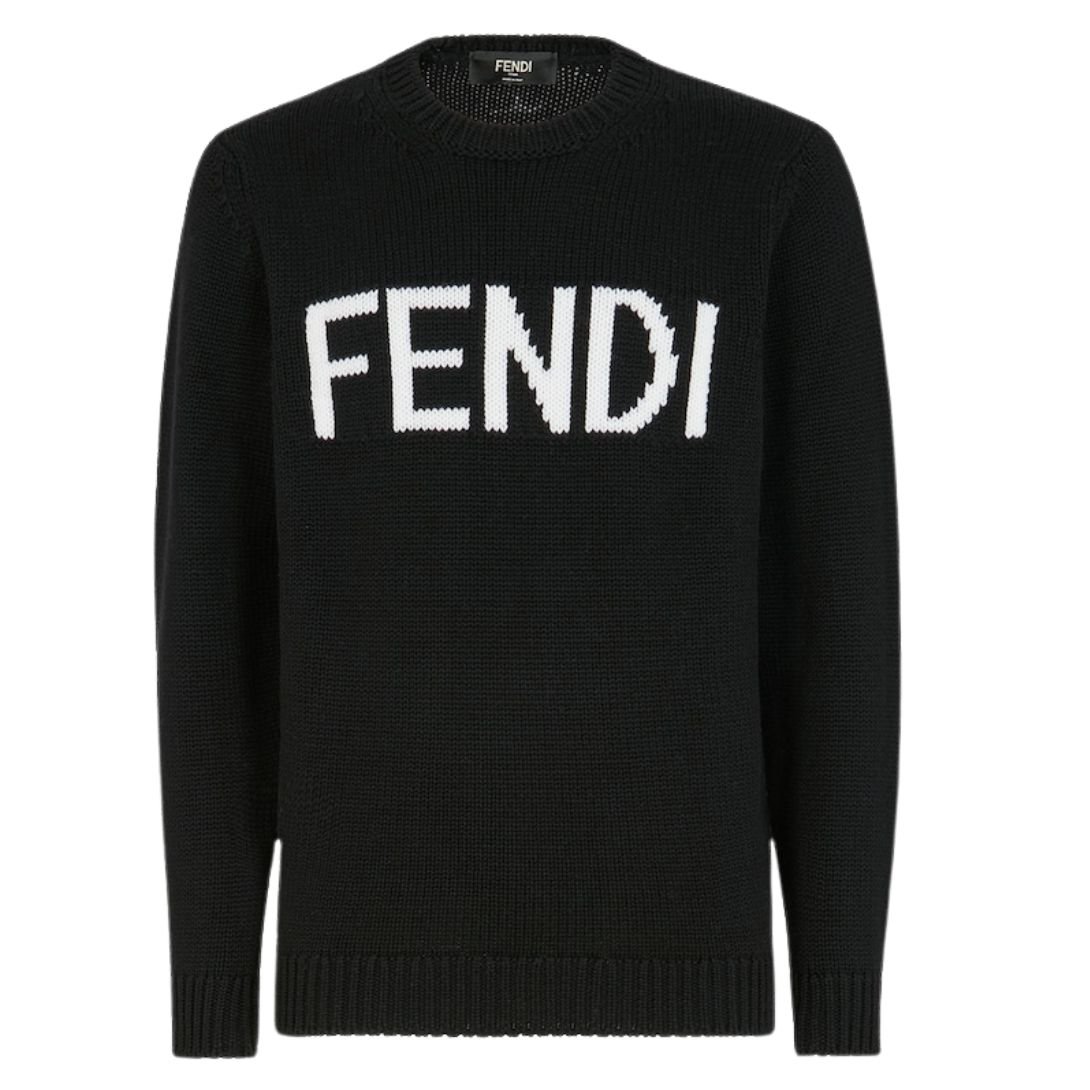 The inlaid FENDI lettering, positioned prominently on the sweater, elevates the overall design. The bold, contrasting color of the lettering makes a stylish statement, allowing this piece to stand out with a subtle yet striking nod to luxury fashion.