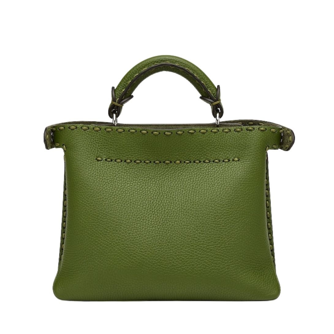 The Small Peekaboo Soft bag is crafted from vibrant green Cuoio Romano leather, featuring a lightweight, flexible construction. Finished with 476 hand-sewn, tone-on-tone macro topstitches, it embodies Fendi’s iconic Selleria craftsmanship, a tradition passed down through generations of artisans since 1925.