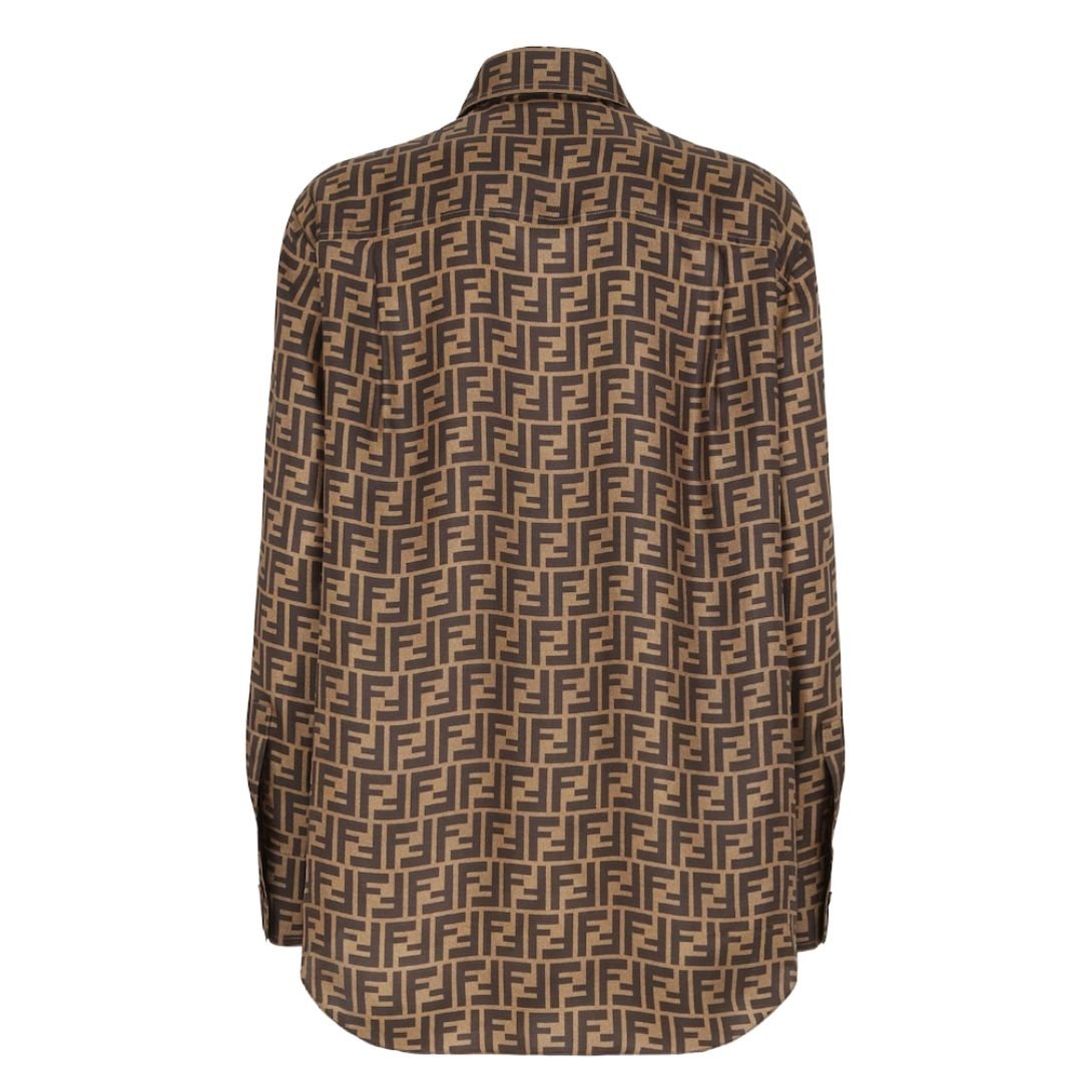 Crafted from luxurious silk twill, the shirt is embellished with an all-over brown jacquard FF motif, offering a distinctive, elegant pattern that pays homage to Fendi’s heritage.