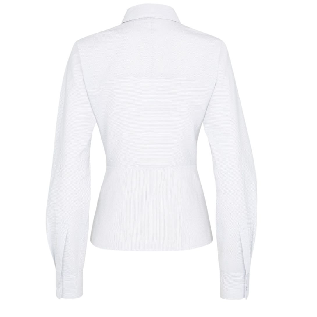 This long-sleeved shirt combines classic tailoring with a feminine silhouette. Featuring a fitted waist and concealed button closure, it exudes understated elegance. The visible stitching on the neckline and waist further accentuates its flattering design.