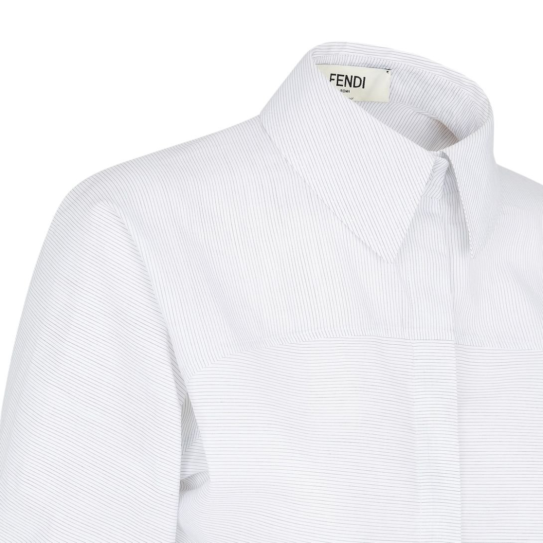Crafted from white cotton with fine stripes, the shirt is embellished with a matching embroidered Fendi Roma logo on the left-side cuff. This subtle yet distinctive detail adds a touch of luxury to its timeless style.