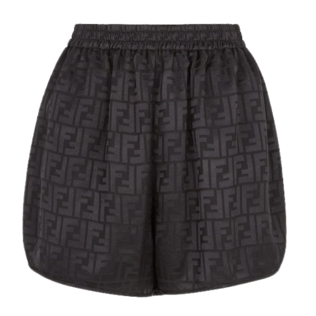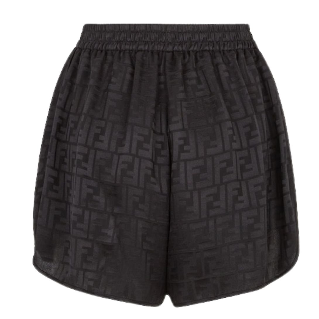 Made from 100% silk, these shorts are crafted from smooth black silk crêpe, featuring an all-over jacquard FF motif. The fabric provides a soft, fluid drape, while the jacquard pattern adds texture and sophistication, making these shorts an elevated addition to any wardrobe.