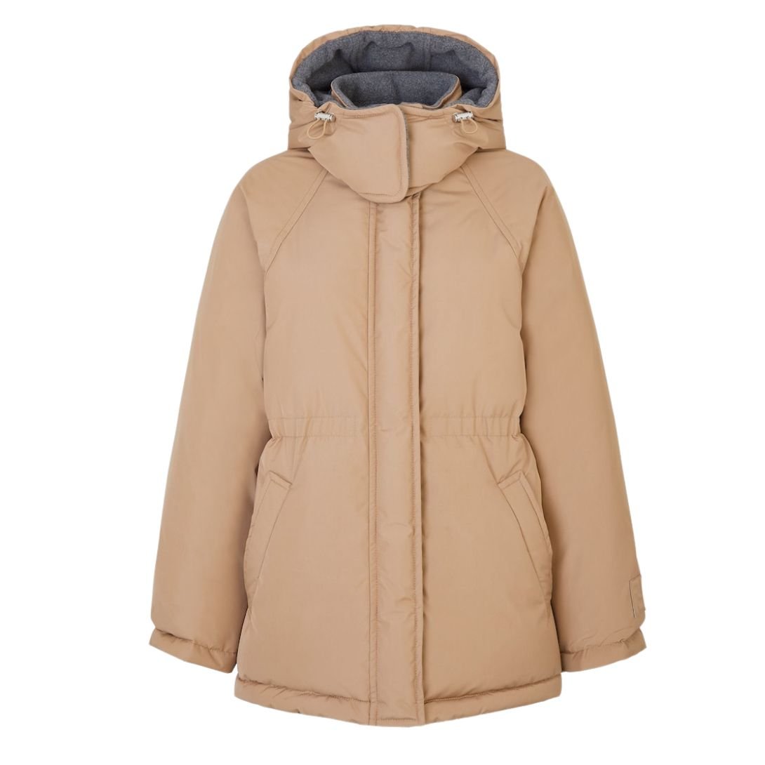 One side of the jacket is crafted from beige nylon with a matte finish for a sleek, sporty look. The reverse side showcases a luxurious gray wool and cashmere blend with matching technical fabric sleeves, offering a refined aesthetic for more formal settings.
