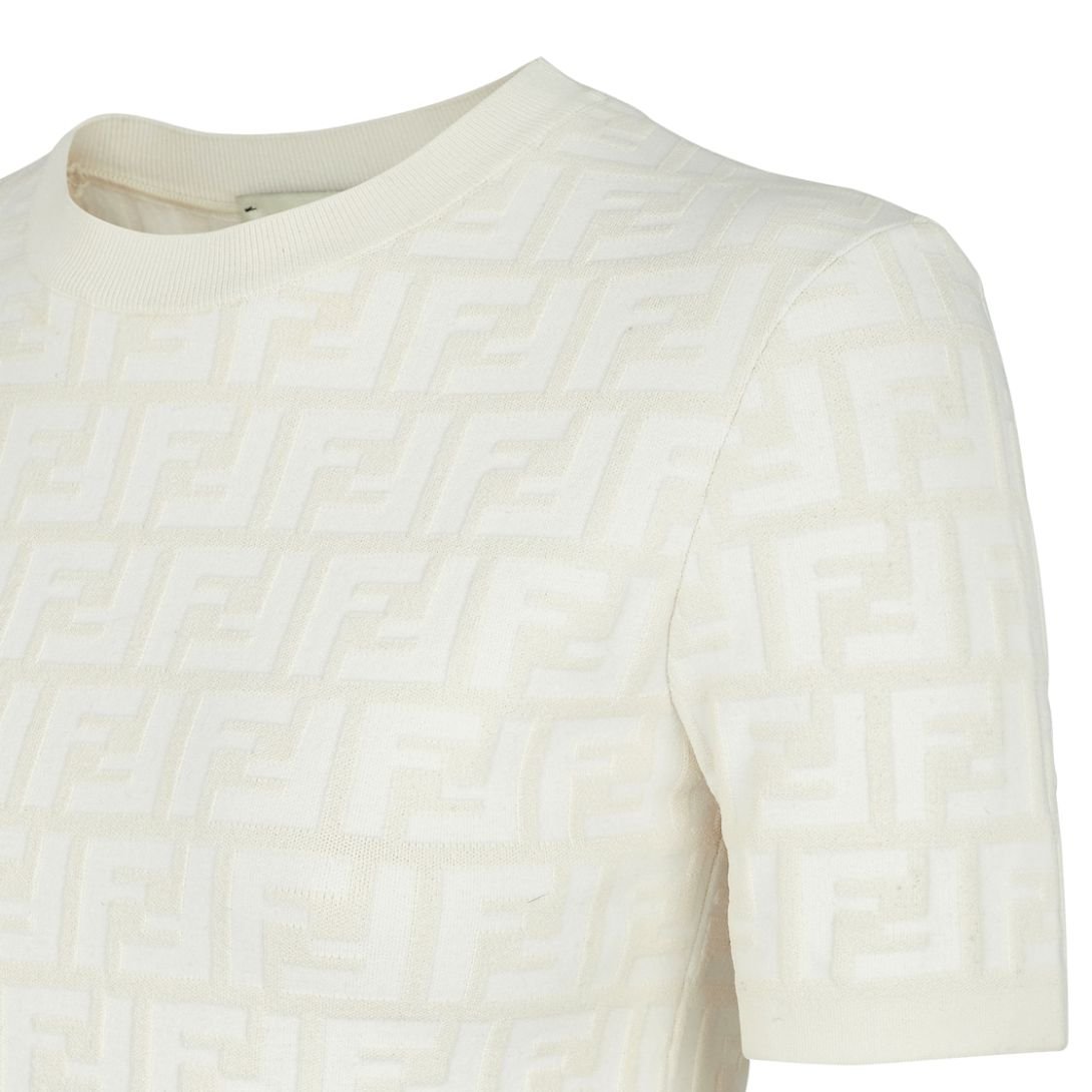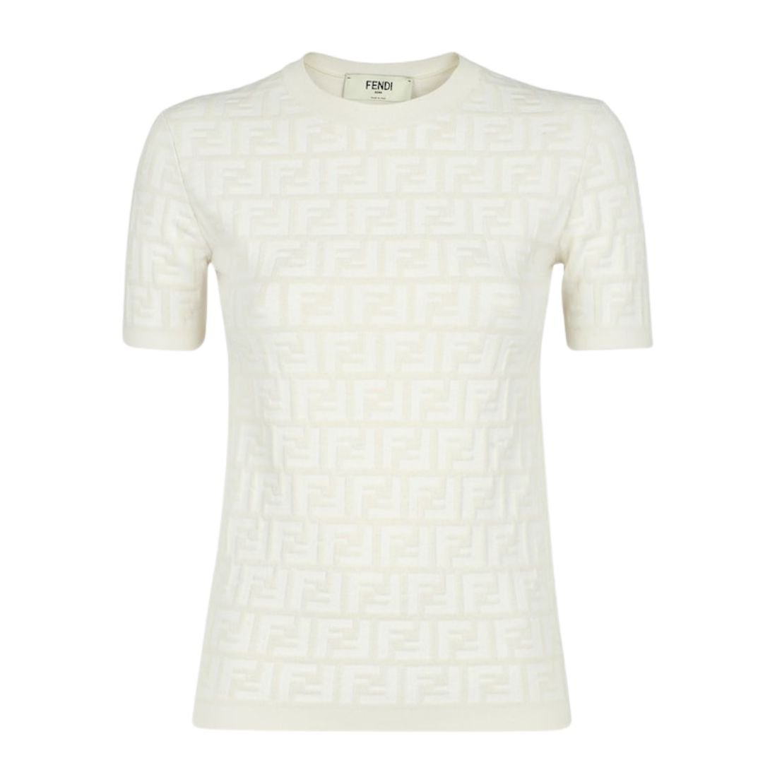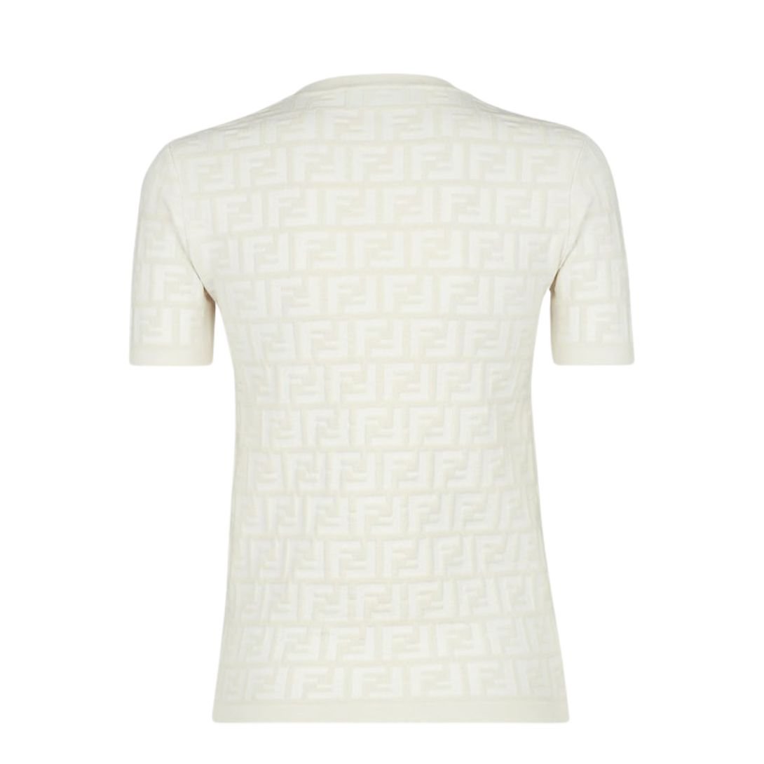 This short-sleeved crew-neck sweater is a sleek and timeless piece, crafted in a white viscose knit adorned with an all-over FF motif intarsia. Its clean design and slim fit make it a versatile addition to any wardrobe, offering a subtle nod to Fendi’s iconic aesthetic.