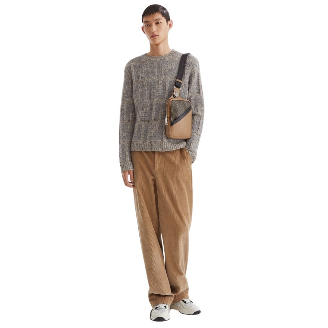 The standout feature of this pullover is the all-over oversized FF pattern, meticulously crafted using crochet techniques. This iconic design element pays homage to Fendi’s signature branding while adding a unique textural appeal. The blend of beige and gray tones creates a versatile look that pairs effortlessly with various outfits.