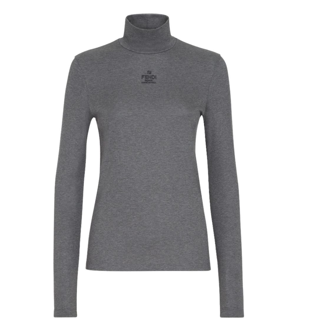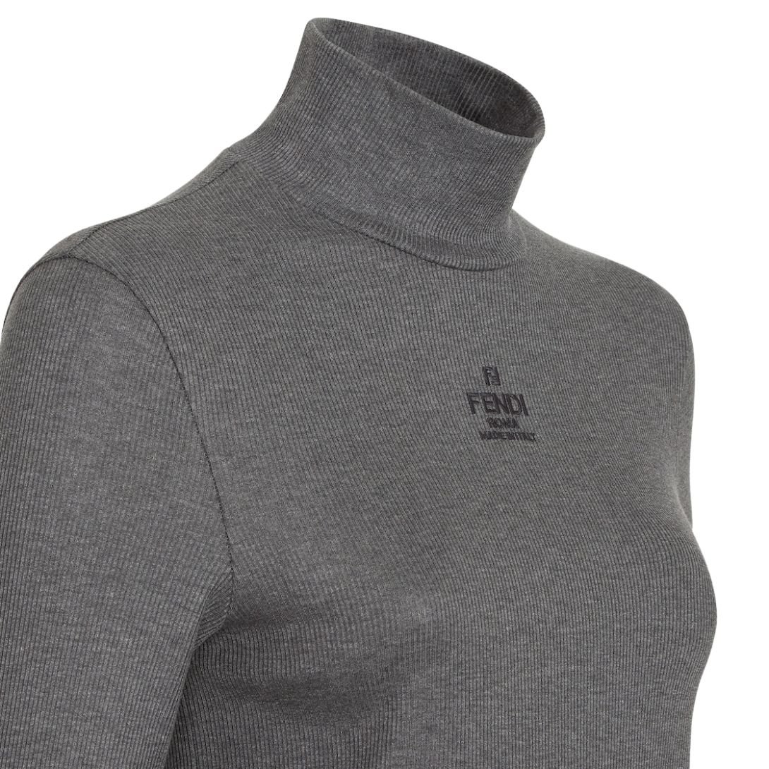 This slim-fit polo neck jumper is a sophisticated yet comfortable addition to any wardrobe. Made from soft gray mélange cotton jersey, it offers a cozy, breathable feel, perfect for layering in cooler months. The high polo neck and long sleeves provide warmth and style, while the ribbed texture adds depth and detail to the design. The jumper is subtly decorated with an embroidered, tone-on-tone Fendi Roma logo on the front, giving it a refined and understated touch of luxury. Its slim fit creates a sleek and modern silhouette, making it perfect for both casual and semi-formal occasions.
