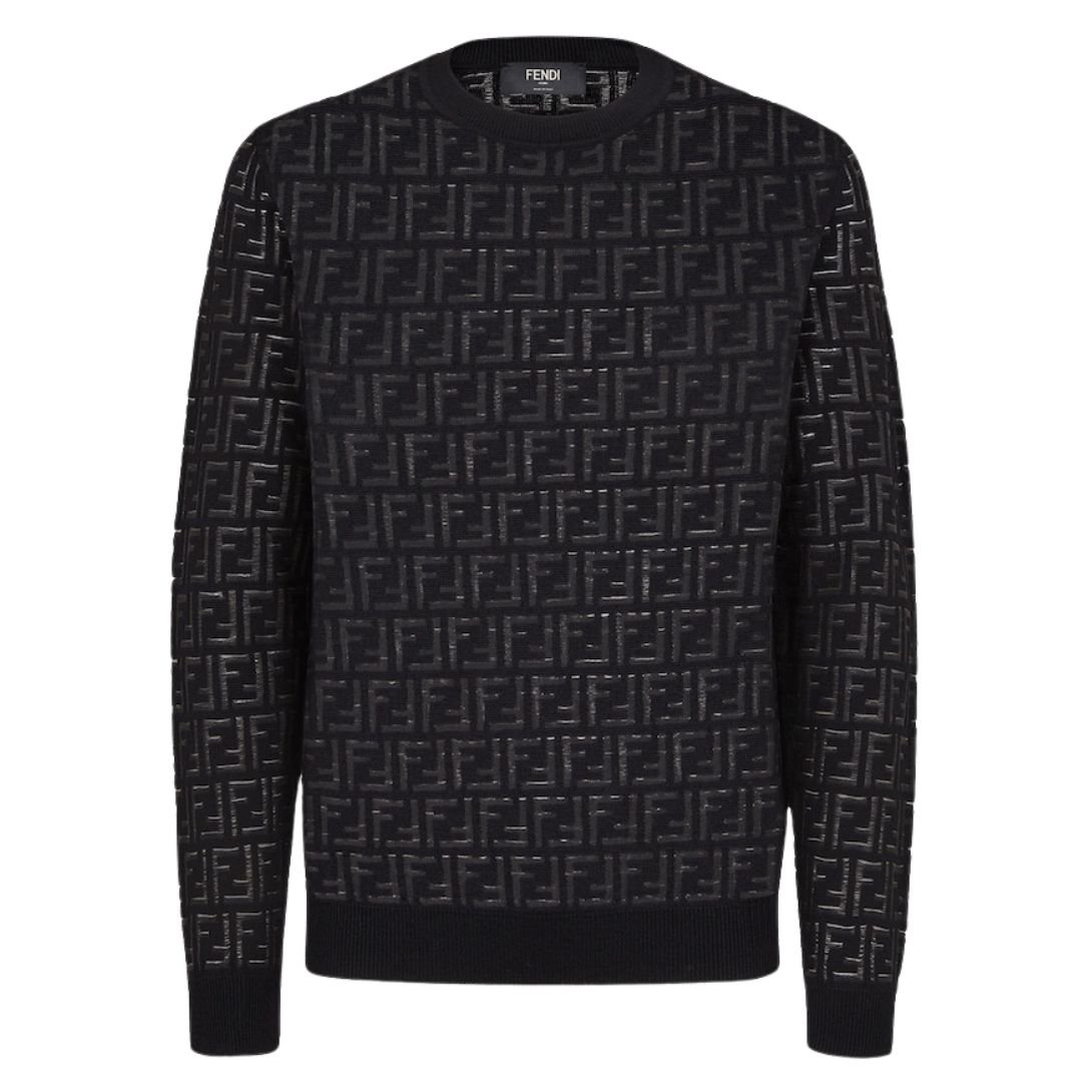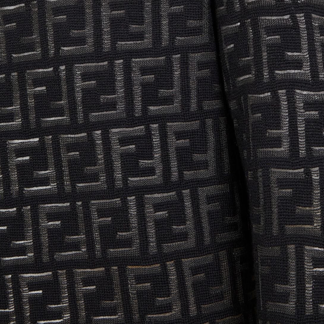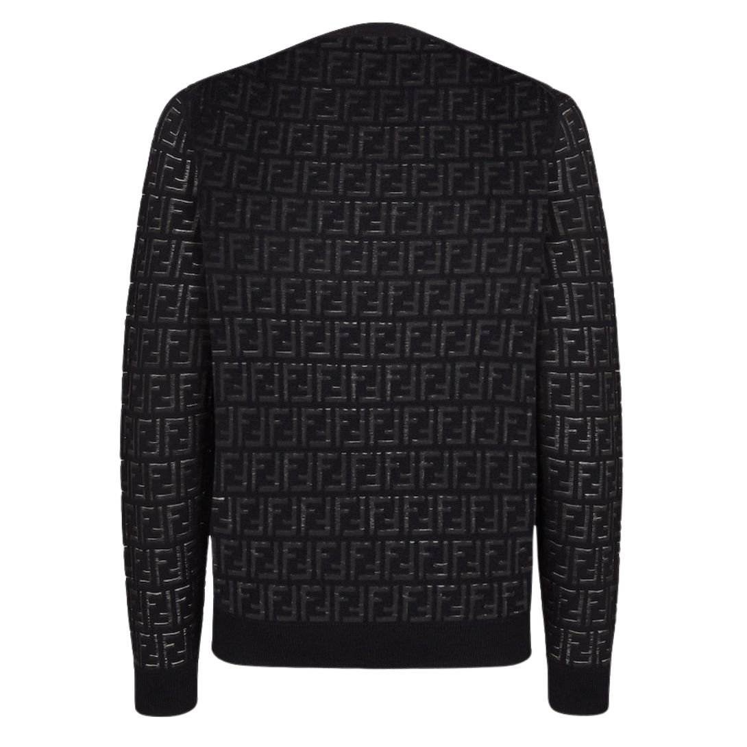 This regular-fit crew-neck pullover is a sophisticated piece that effortlessly combines comfort with luxury. Made from midnight BLACK wool, the sweater features an all-over nylon FF intarsia pattern in on-tone colors, creating a subtle sheer-opaque effect. This unique design adds depth and texture, making the sweater an eye-catching yet refined choice for your wardrobe.