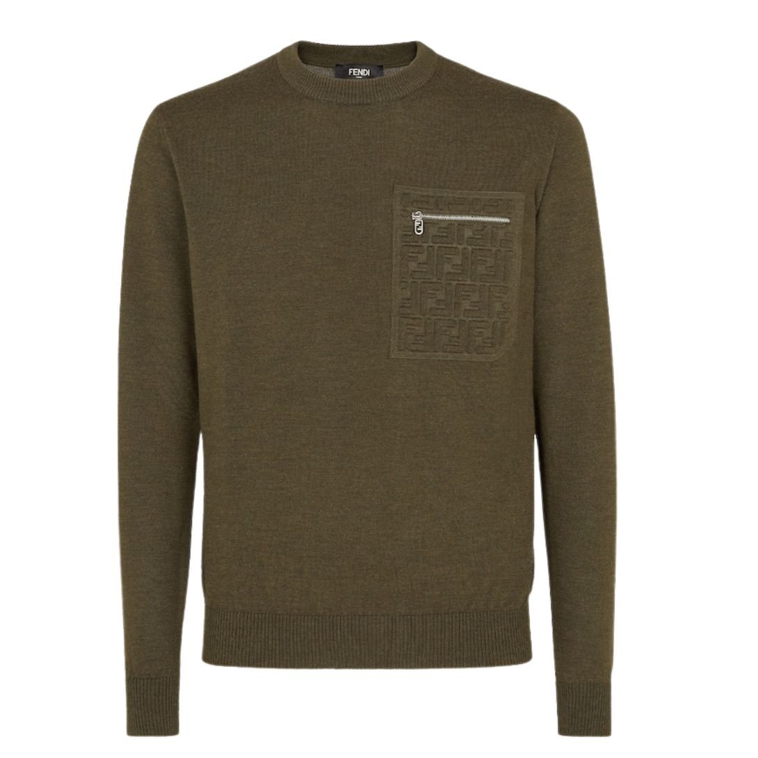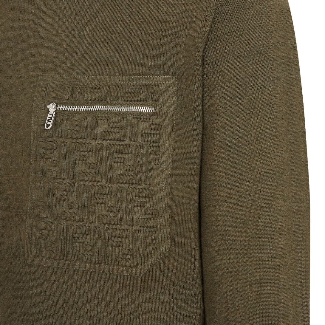 The zipped breast pocket with the embossed FF and Fendi O’Lock metal slider adds a layer of modern functionality and luxury. This refined detailing makes the sweater unique and elevated, perfect for those who appreciate subtle, high-end fashion.