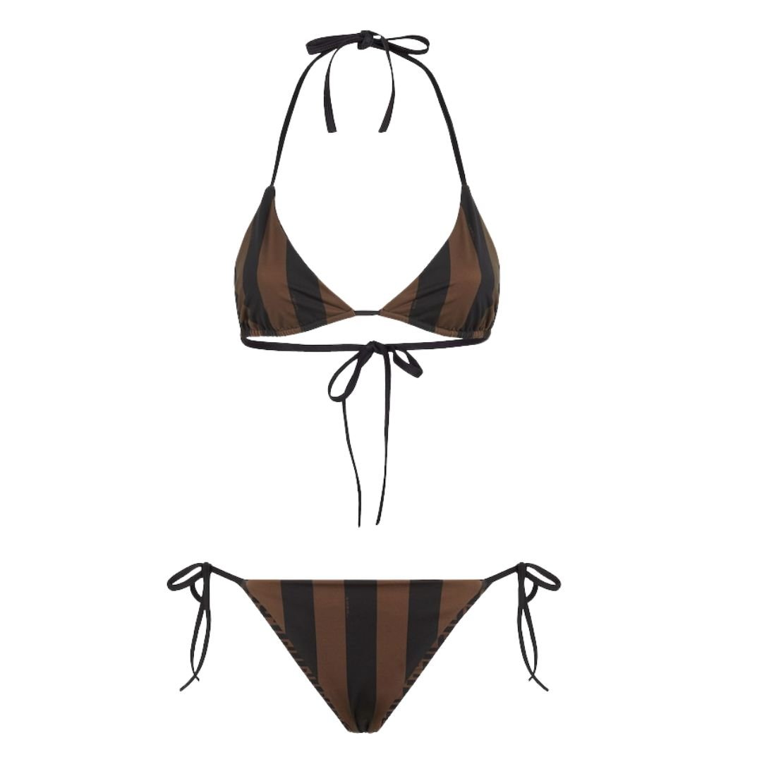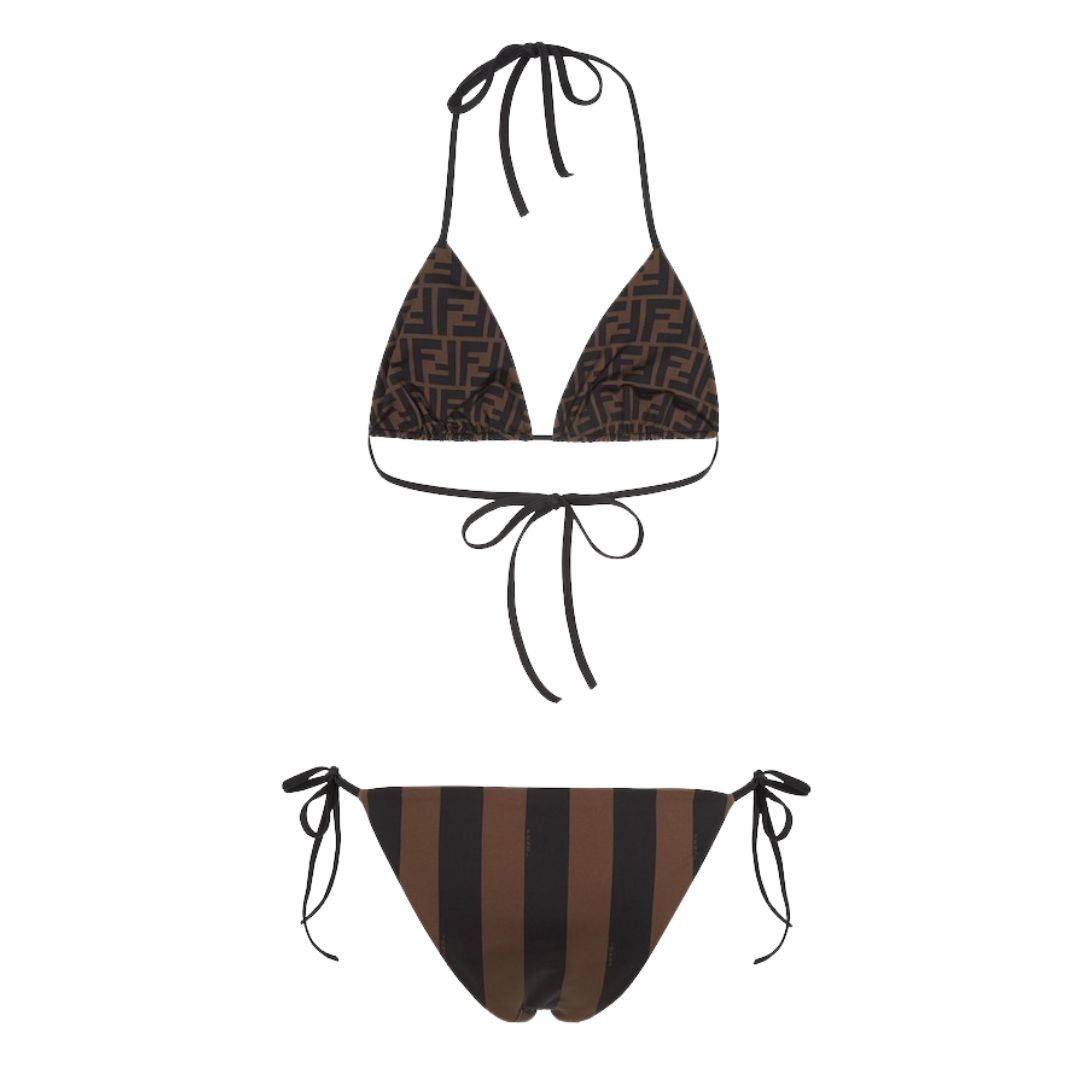 This two-piece reversible swimsuit features a triangle bra and matching briefs, designed to blend elegance and versatility. The outer layer showcases iconic brown Pequin stripes, while the reversible FF lining mirrors the same sophisticated color palette.