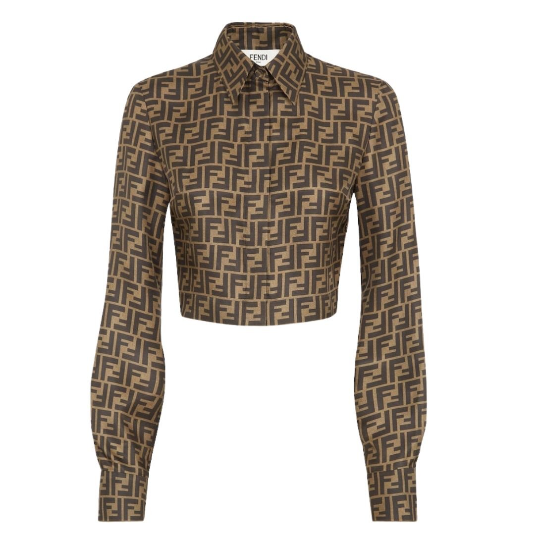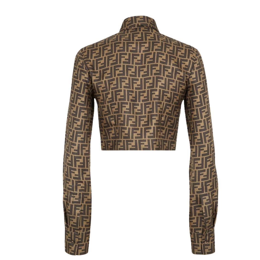 Crafted from luxurious silk twill, the top is adorned with the iconic Fendi FF motif in brown, making it a signature statement piece that reflects the brand’s heritage.