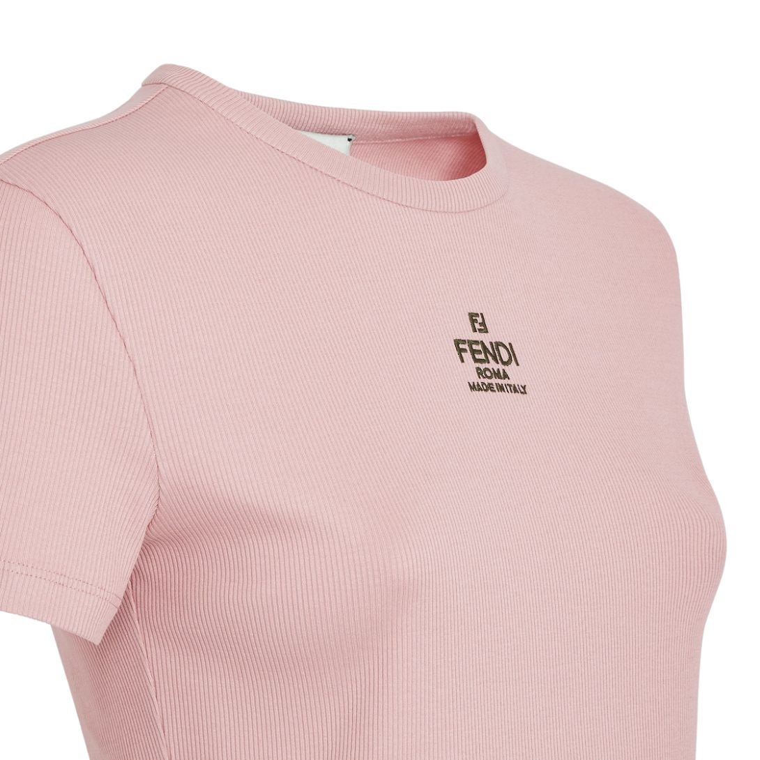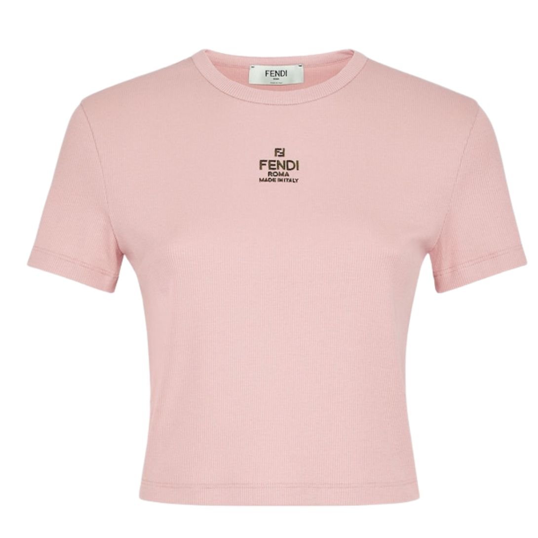 This cropped, slim-fitting top is a perfect combination of femininity and sophistication, offering a modern twist on classic casual wear. Made from a blend of 94% cotton and 6% elastane, the top ensures a comfortable and slightly stretchy fit that contours to the body. The light pink cotton jersey is subtly enhanced with ribbed detailing, adding texture and depth to the design. The tone-on-tone embroidered Fendi Roma logo on the front gives it a refined, luxurious touch. With a crew neck and short sleeves, this versatile top pairs beautifully with high-waisted trousers, skirts, or shorts.