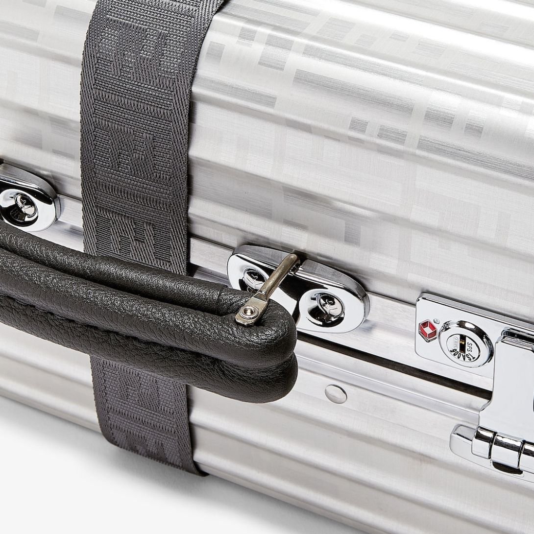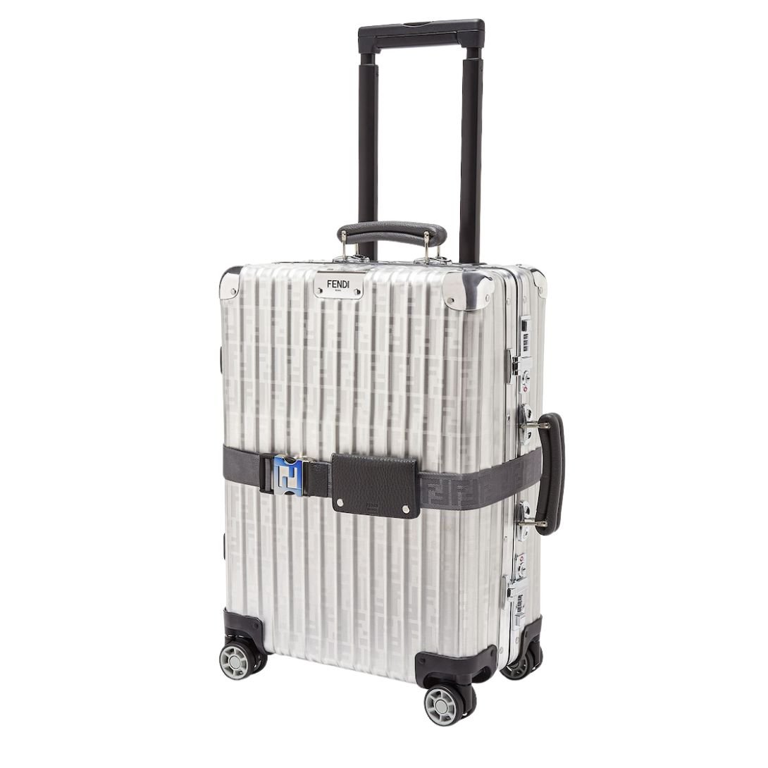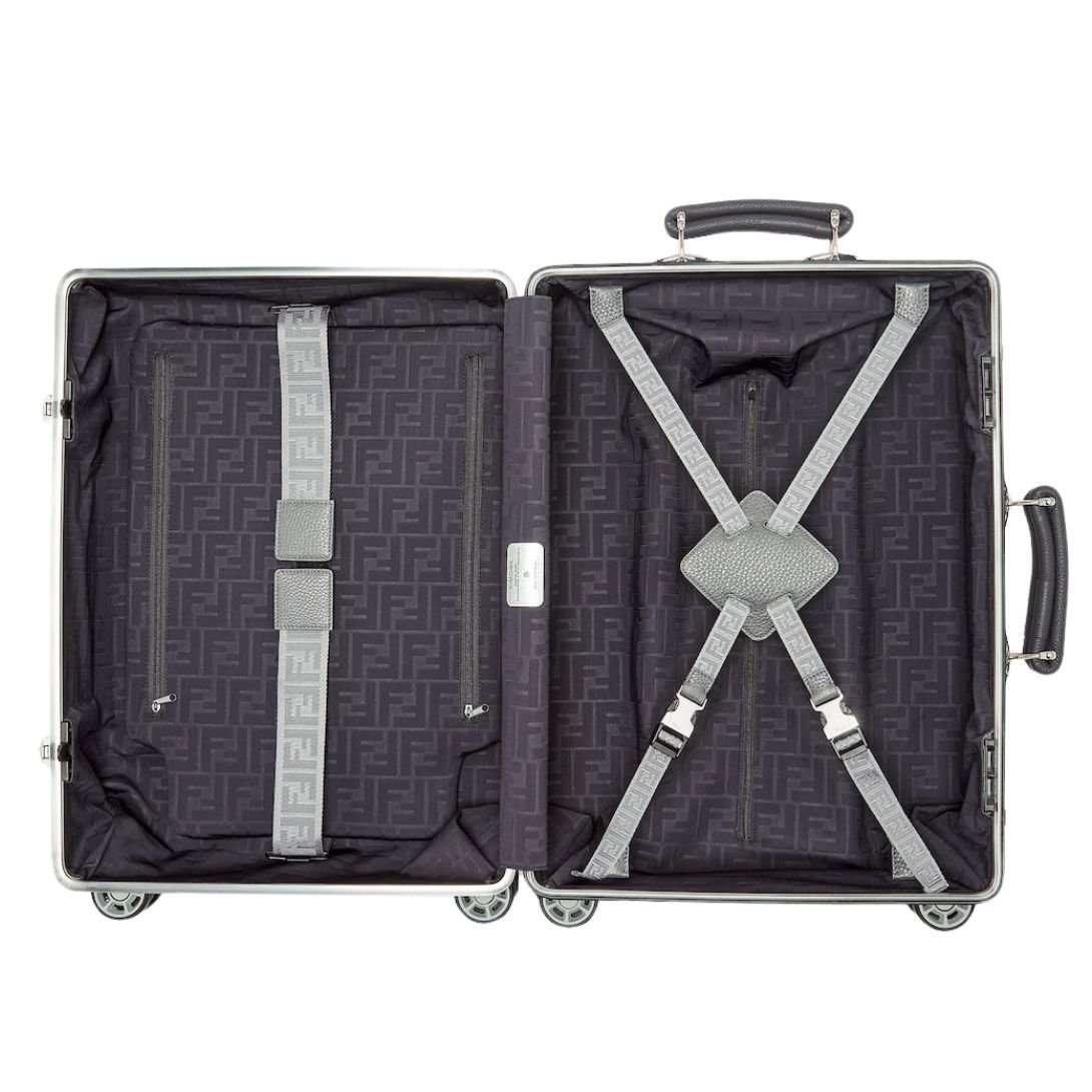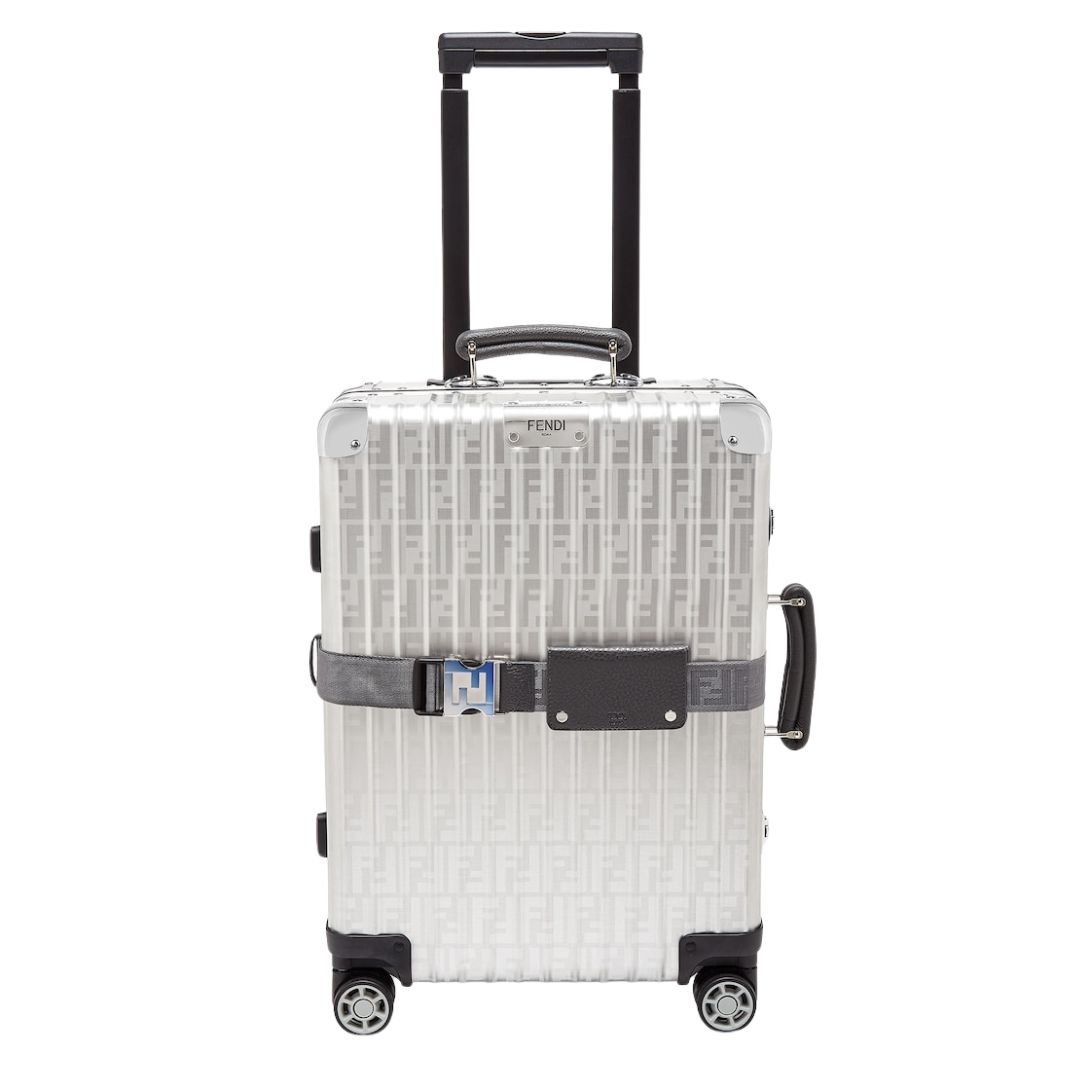 This four-wheeled cabin-sized suitcase is crafted from durable aluminium, featuring the iconic FF motif and stylish gray Cuoio Romano leather details. The sleek design is both lightweight and robust, making it the perfect travel companion for those who value both luxury and functionality.