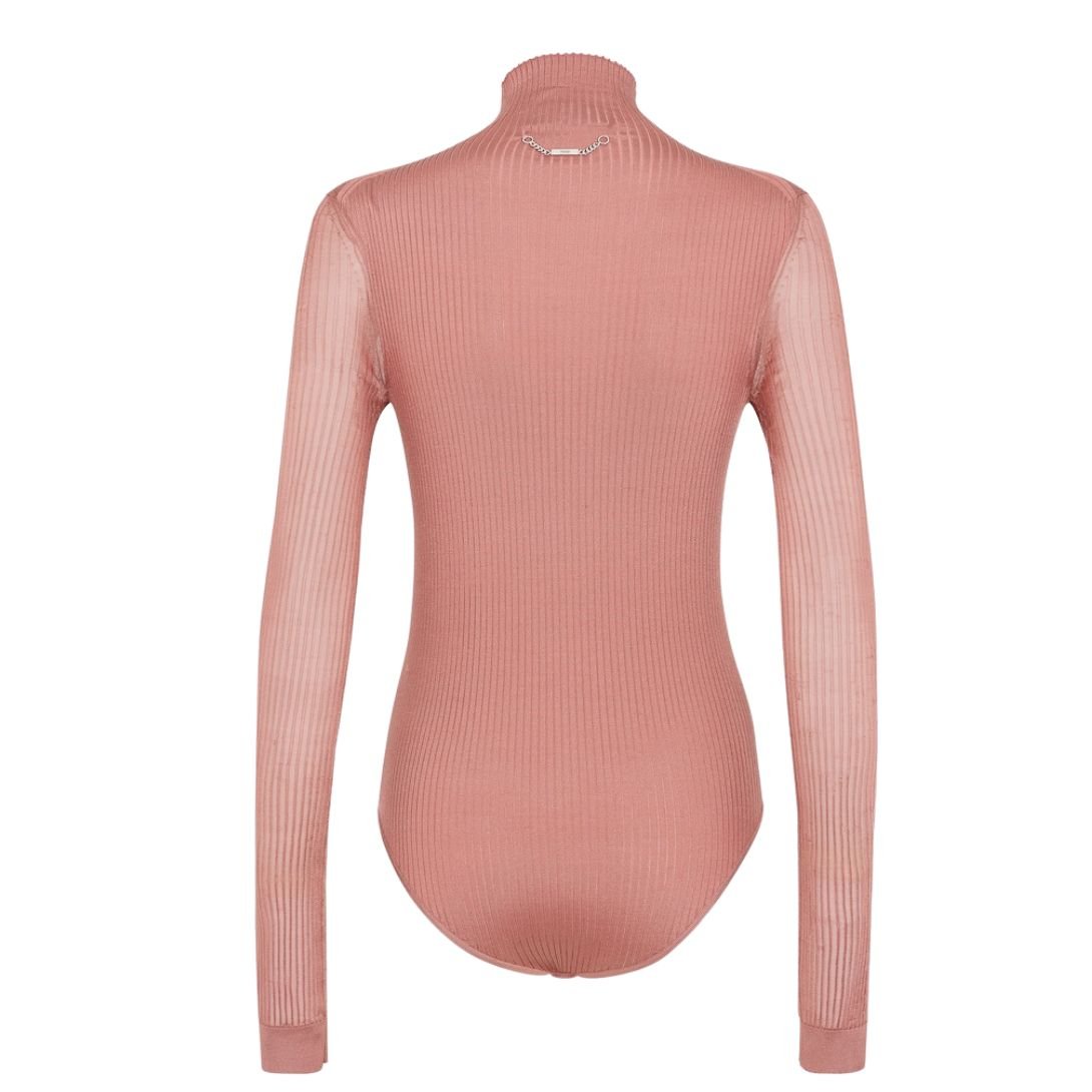 This light pink bodycon bodysuit is a stylish essential for a modern wardrobe. The ribbed texture, high collar, and long sleeves create a sleek silhouette, while the palladium-finish Fendi Roma tag adds a refined touch of elegance.