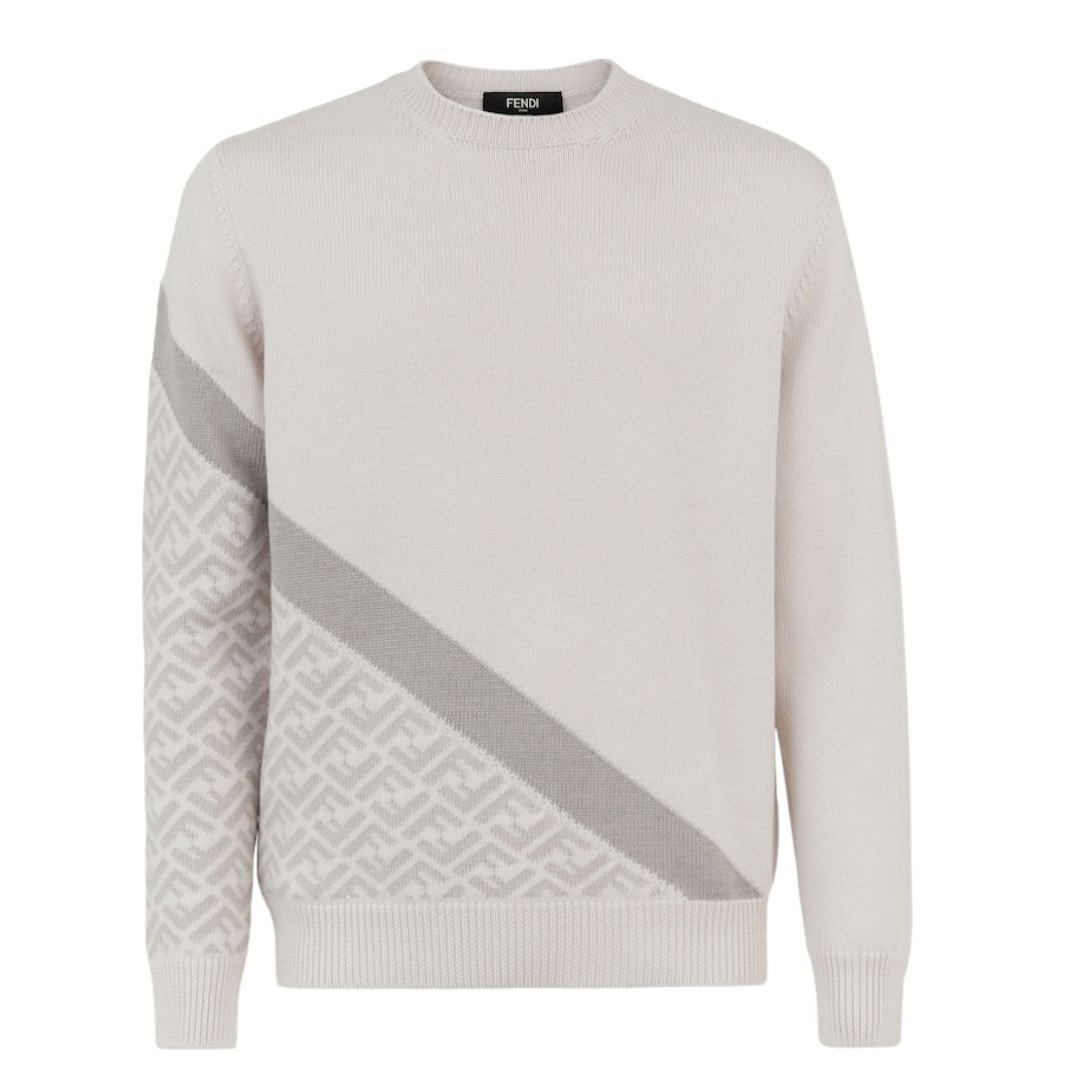 The Fendi Diagonal insert and tonal color block stripes across the front and sleeve add a touch of luxury and sophistication. Ribbed edges enhance the structure of the sweater, contributing to its refined and polished look. These distinctive details make the sweater stand out while staying true to Fendi’s signature style.