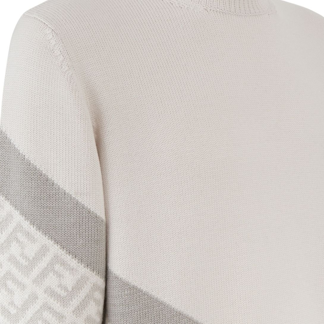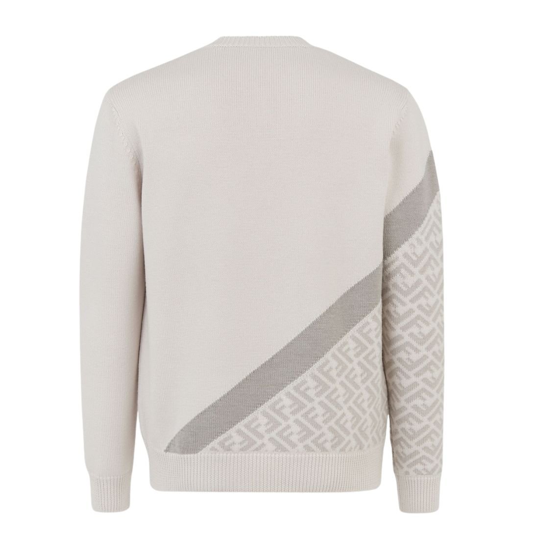 This regular-fit crew-neck sweater offers a fresh take on a classic style. Made from ice white wool, it provides a bright, clean base that pairs easily with a variety of outfits. The sweater is customized with a Fendi Diagonal insert on the front and right sleeve, featuring shades of light gray and white along with tonal color block stripes. These modern design elements infuse the piece with an elegant yet dynamic aesthetic, perfect for making a statement while maintaining a timeless appeal.