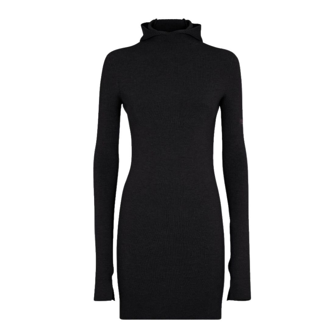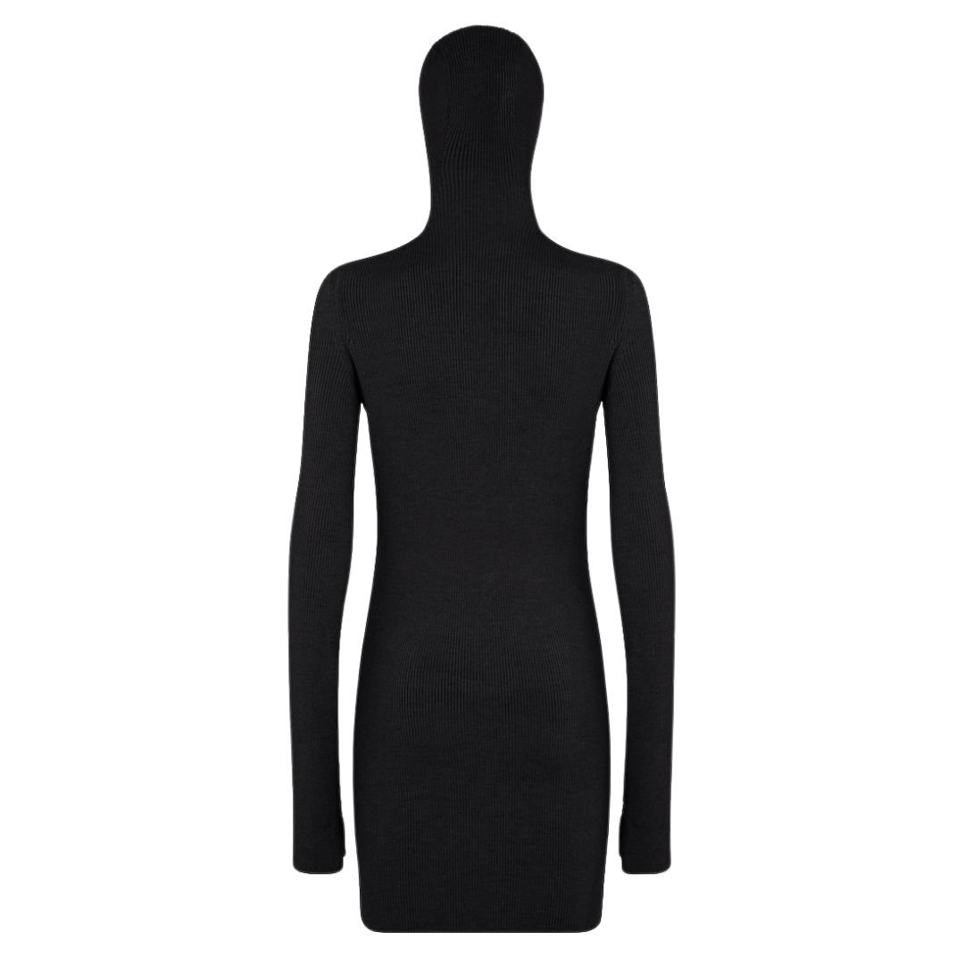 Made from a blend of soft wool and silk ribbed jersey in black, the fabric provides warmth, softness, and a luxurious feel. The ribbed texture adds subtle depth and movement to the dress.