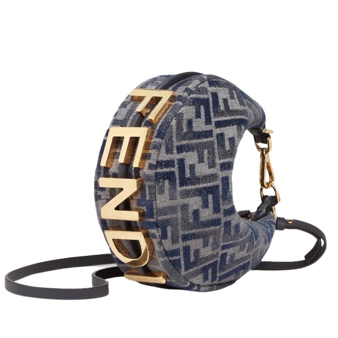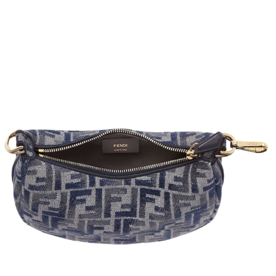 - Made of chenille featuring the iconic FF motif in dark blue, adding a textured and luxurious look to the bag. The motif is paired with vintage gold-finish metal FENDI lettering on the base, which is visible when the bag is worn, adding a unique and bold touch.