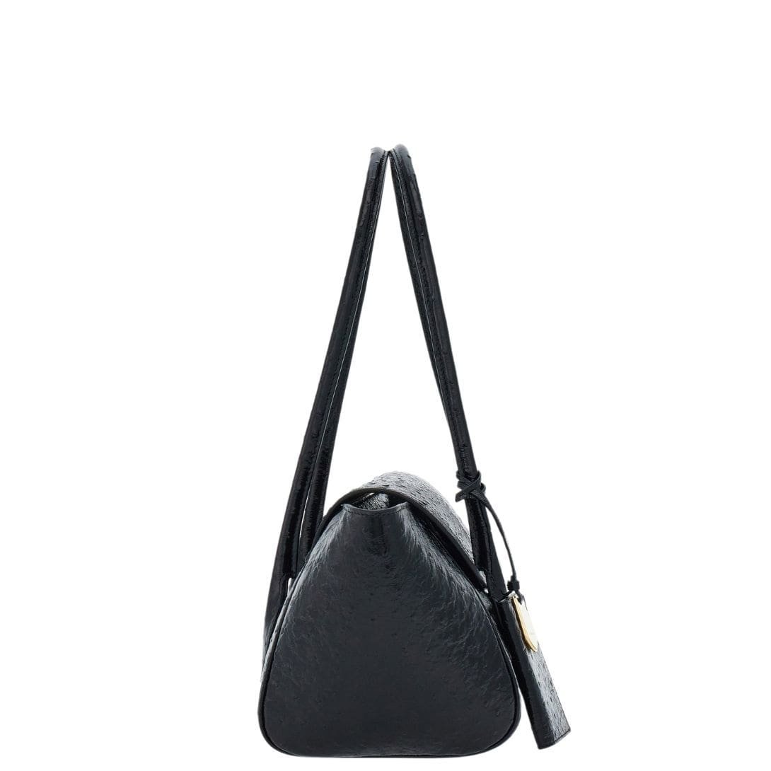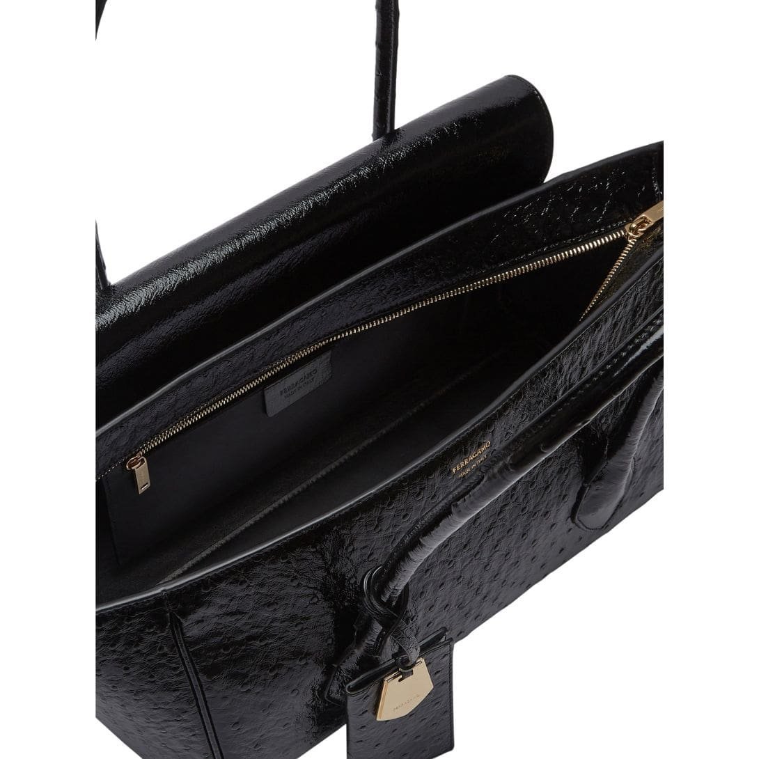 Journey through the transformative history of the FERRAGAMO EAST-WEST TOTE BAG (M), reimagined in the epitome of luxury: exclusive patent ostrich leather. The East-West line masterfully balances width and volume, reminiscent of the classic bowling bag silhouette, while offering an innovative twist.