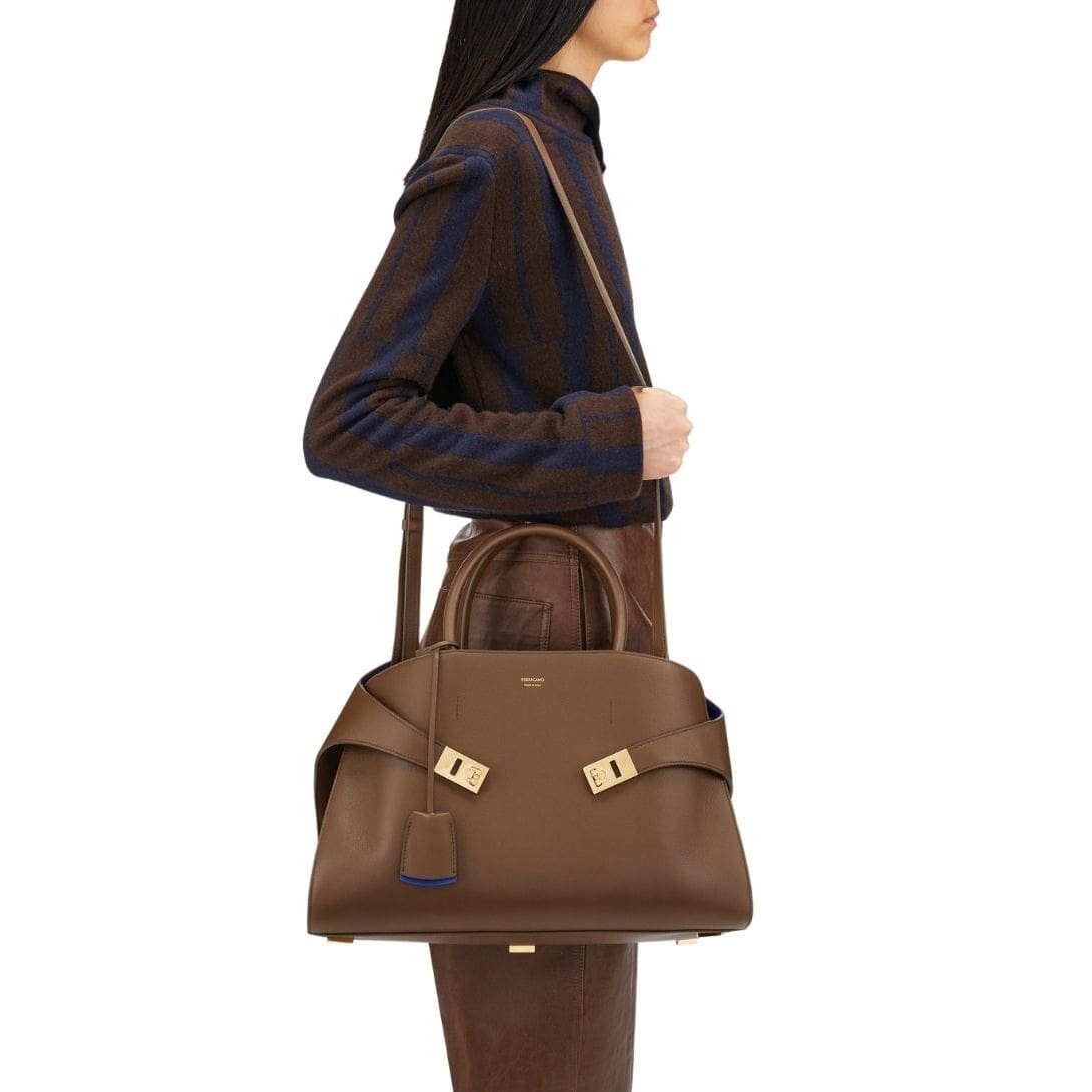 Step into the world of timeless elegance with the latest addition to our collection: the retro-inspired Ferragamo Hug handbag (S), reimagined for the modern connoisseur. Crafted from sumptuously soft natural-grain calfskin panels, this compact version exudes an air of refined sophistication and understated luxury.