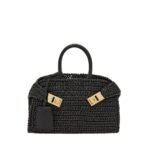 Innovative and captivating, the Ferragamo Hug mini bag introduces a distinctive silhouette crafted from hand-woven raffia, infused with seasonal hues that evoke a sense of warmth and effortless style. Its compact design exudes a sense of cool sophistication, offering a perfect balance of functionality and fashion-forward allure.