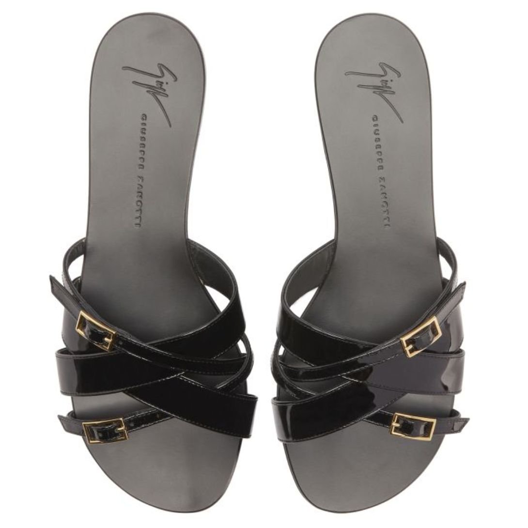 These stylish slide sandals are crafted from glossy black patent leather and feature elegant criss-cross bands. The design is elevated by golden metal buckles, adding a bold yet refined accent to the classic silhouette.