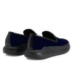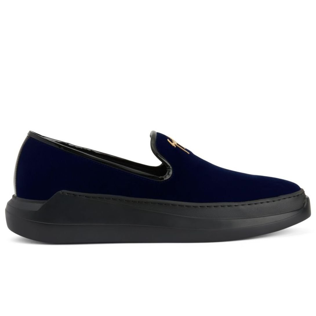 - Material: These slip-ons are crafted from a luxurious velvet-effect blue synthetic fabric, accented with patent-effect black synthetic details for a striking contrast.