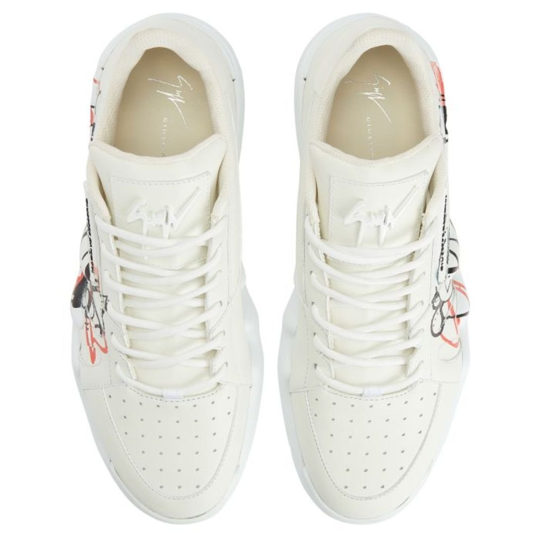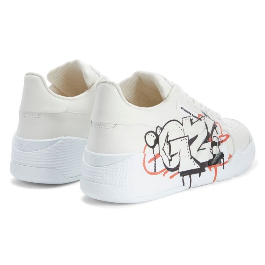 These mid-top ‘Talon’ sneakers combine contemporary artistry with premium craftsmanship. Made from high-quality white leather, they are adorned with a bold black, beige, and red ‘Graffiti’ mural-effect decoration that lends an urban edge. A white lacquered metal ‘Signature’ graces the tongue, while a rubberized ‘Label Signature’ detail enhances the outer side. The look is completed with matching white cotton laces and a sleek white rubber sole with a logo for a flawless finish.