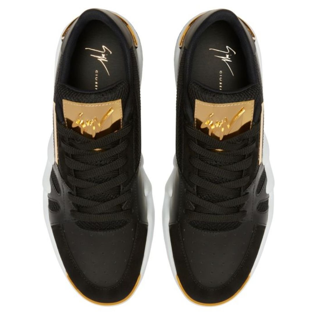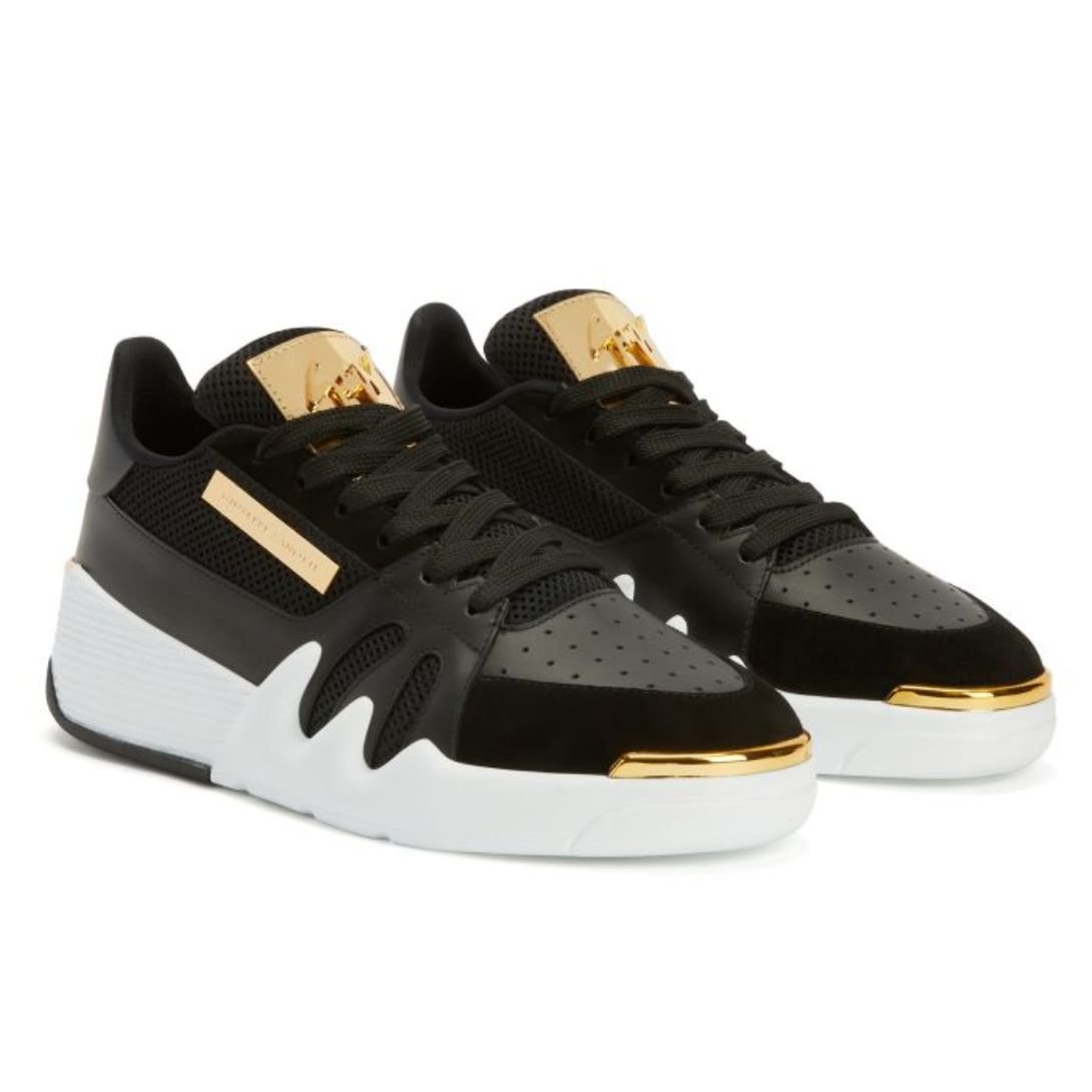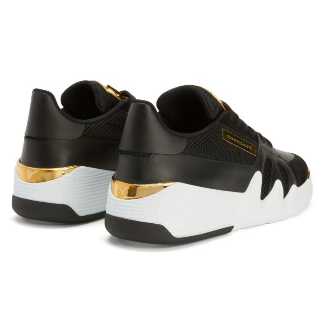 These luxurious mid-top ‘Talon’ sneakers are crafted from a blend of black leather, velour, and synthetic mesh fabric, offering a rich texture and sleek finish. Featuring golden metal ‘Signature’ hardware on the tongue and a matching ‘Label Signature’ on the outer side, the sneakers exude premium sophistication. A white rubber sole with golden chromed spoilers and accents adds a striking contrast, while the black technical fabric inner lining ensures comfort.