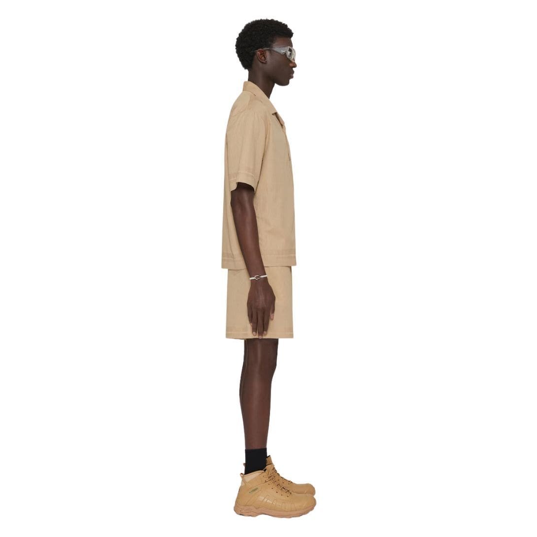 Designed with a boxy fit, this shirt features a relaxed silhouette that adds a contemporary edge to classic tailoring. The boxy fit is intentional, allowing for ease of movement and a modern, slightly oversized look that aligns with current fashion trends. The shirt’s structure is further enhanced by its clean lines and minimalist design, making it a versatile piece that can be dressed up or down.