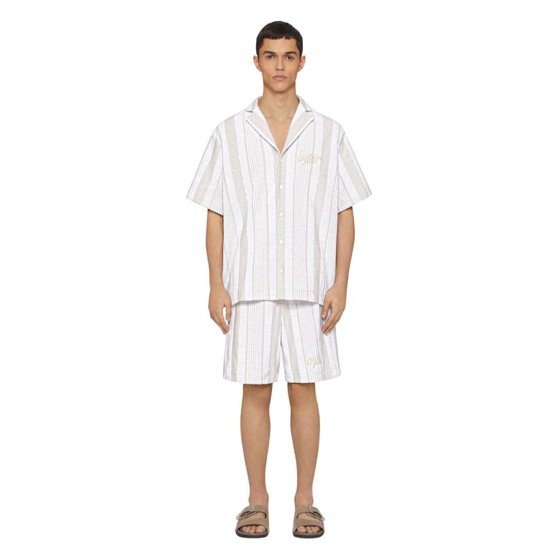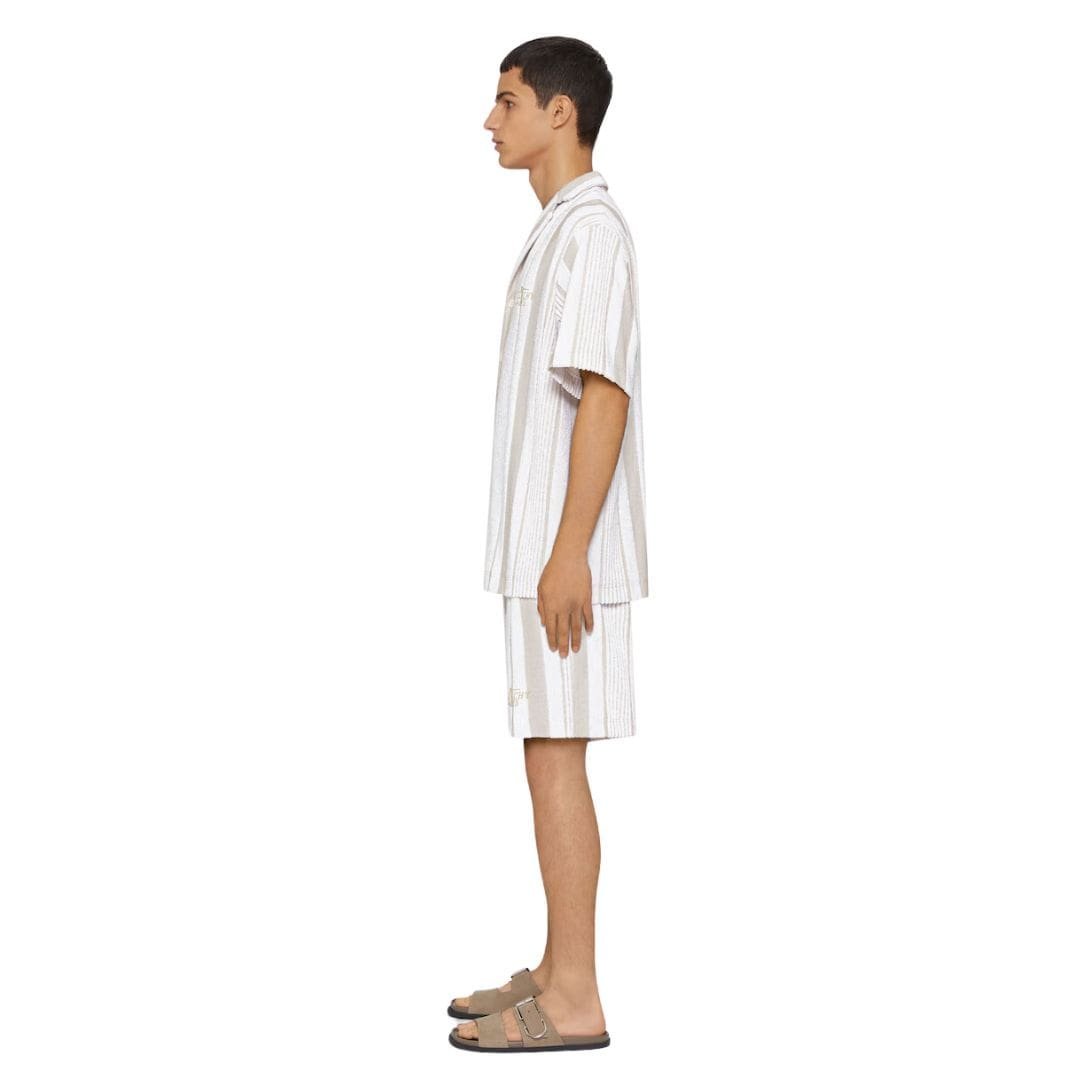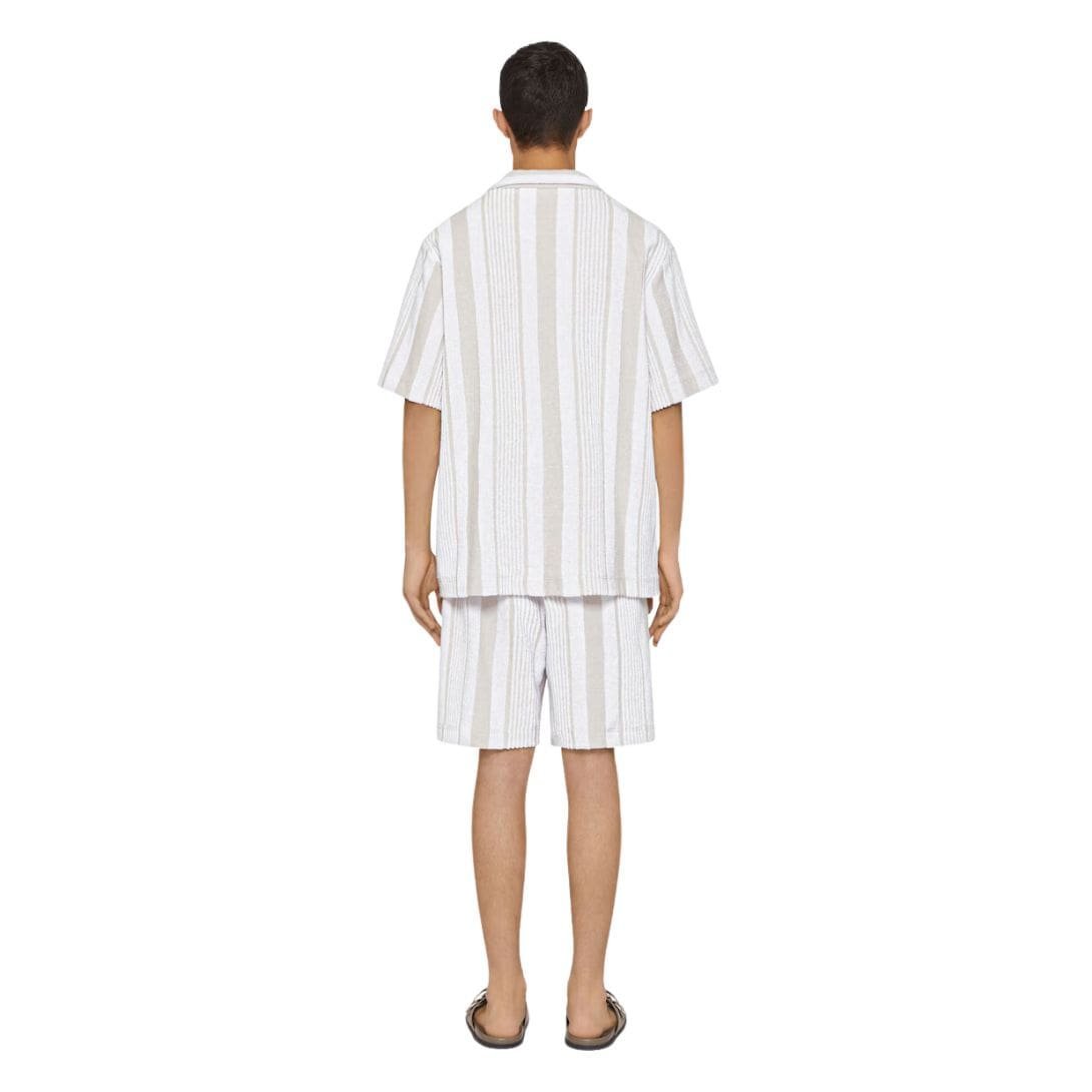 Adorning the shirt is a series of striking stripes that run horizontally across the fabric. These stripes are meticulously aligned and vary in width, creating a dynamic visual effect that adds depth and interest to the garment. The color palette of the stripes is thoughtfully chosen to harmonize with the base shade of the toweling, offering a refined and modern aesthetic.