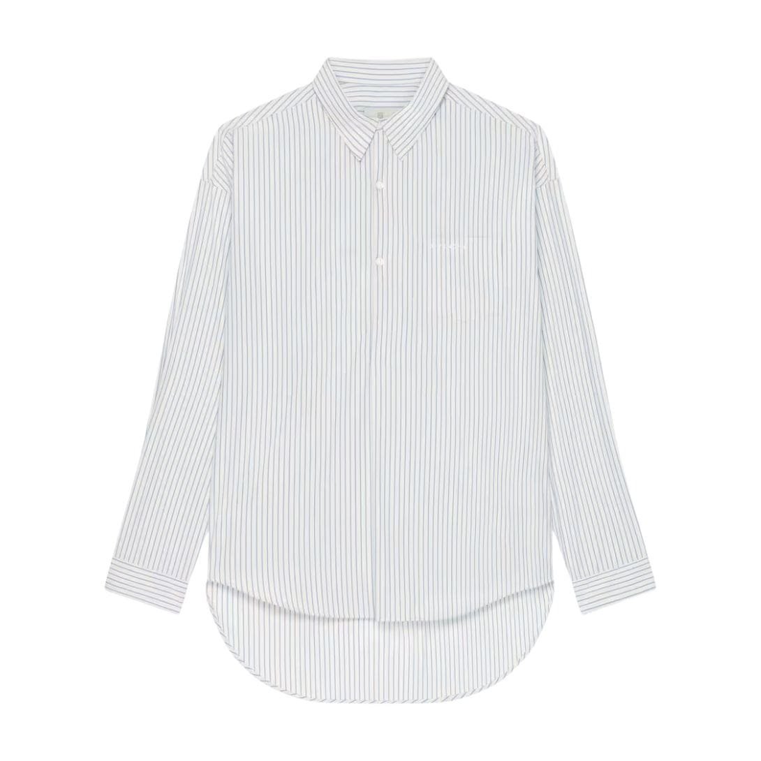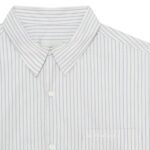 Attention to detail is evident in the finishing touches of this shirt. The collar is a refined point, maintaining a sophisticated edge even in the oversized fit. The button placket, running down the front, is carefully crafted to align with the striped pattern, ensuring a seamless look. The long sleeves can be styled in various ways, either rolled up for a casual vibe or worn down for a more polished appearance.